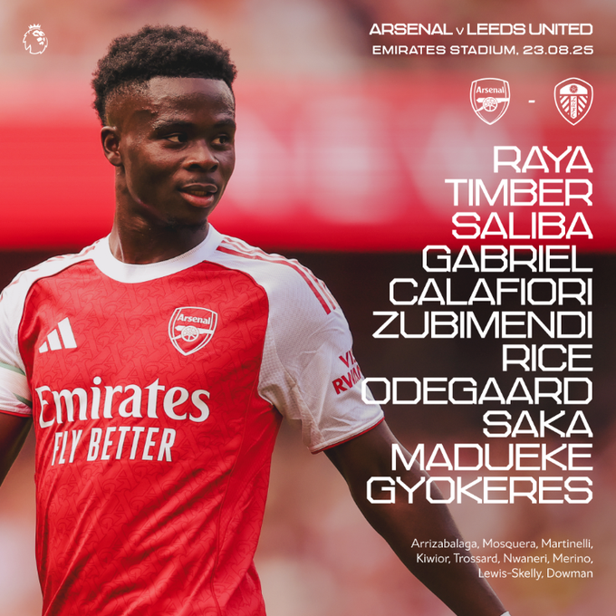 يبدأ ميكيل أرتيتا المدير الفني لنادي أرسنال، المباراة أمام ليدز يونايتد، ضمن مباريات الجولة الثانية من الدوري الإنجليزي الممتاز، بتشكيل مكون من: