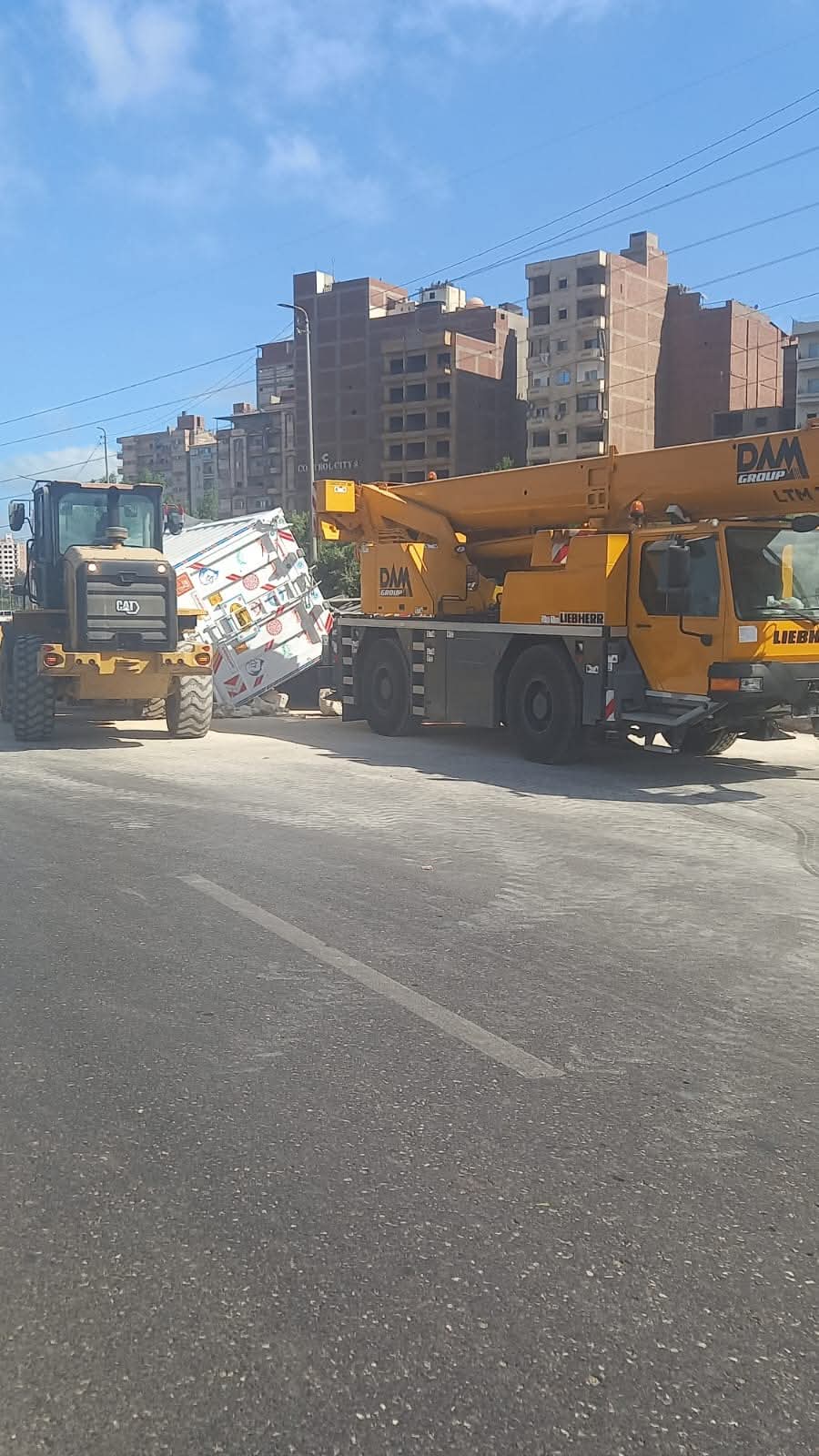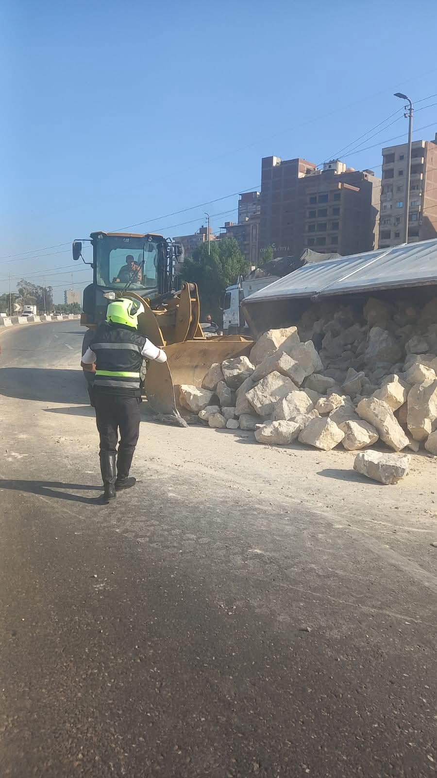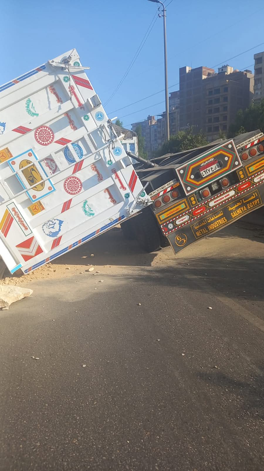 انقلاب تريلا محملة بالحجارة يتسبب في شلل مروري على الطريق الدائري بالمنصورة