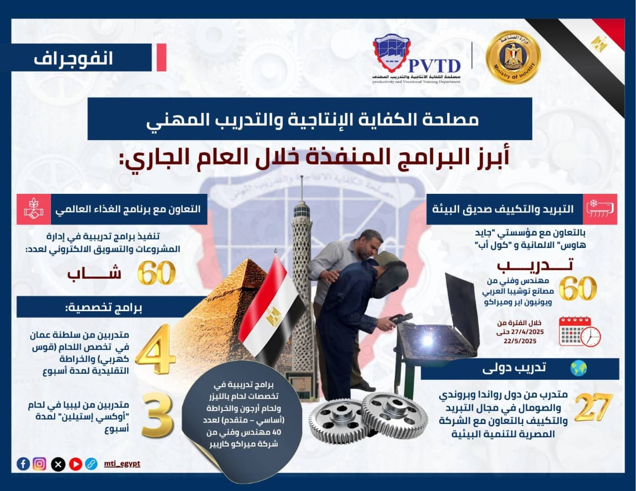 وتنفذ مصلحة الكفاية الإنتاجية والتدريب المهني برامج متميزة من خلال شراكات استراتيجية تقيمها المصلحة مع كبريات الشركات والمؤسسات الصناعية لتأهيل الكوادر الفنية وفق المعايير العالمية، ومن أبرز البرامج التي نفذتها المصلحة العام الجاري بالشراكة مع المؤسسات الدولية برنامج تدريبي في مجال التبريد والتكييف صديق البيئة بالتعاون مع مؤسستي "جايد هاوس" الالمانية و "كول أب" لعدد 60 مهندس وفني من مصانع توشيبا العربي ويونيون اير وميراكو خلال الفترة من 27/4/2025 حتى 22/5/2025، تدريب 27 متدرب من دول رواندا وبروندي والصومال في مجال التبريد والتكييف بالتعاون مع الشركة المصرية للتنمية البيئية، والتعاون مع برنامج الغذاء العالمي في تنفيذ برامج تدريبية في إدارة المشروعات والتسويق الإلكتروني لعدد 60 شابا.