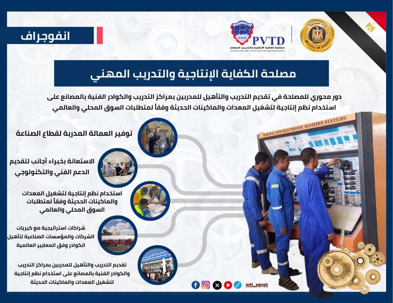 تواصل مصلحة الكفاية الإنتاجية والتدريب المهني دورها في توفير العمالة المدربة لقطاع الصناعة والاستعانة بخبراء أجانب، بهدف تقديم الدعم الفني والتكنولوجي بهدف تطوير الصناعة وزيادة الإنتاج وتقديم التدريب والتأهيل للمدربين بمراكز التدريب والكوادر الفنية بالمصانع على استخدام نظم إنتاجية لتشغيل المعدات والماكينات الحديثة، وفقاً لمتطلبات السوق المحلي والعالمي، وذلك في إطار توجيهات الفريق مهندس كامل الوزير، نائب رئيس مجلس الوزراء للتنمية الصناعية وزير الصناعة والنقل.