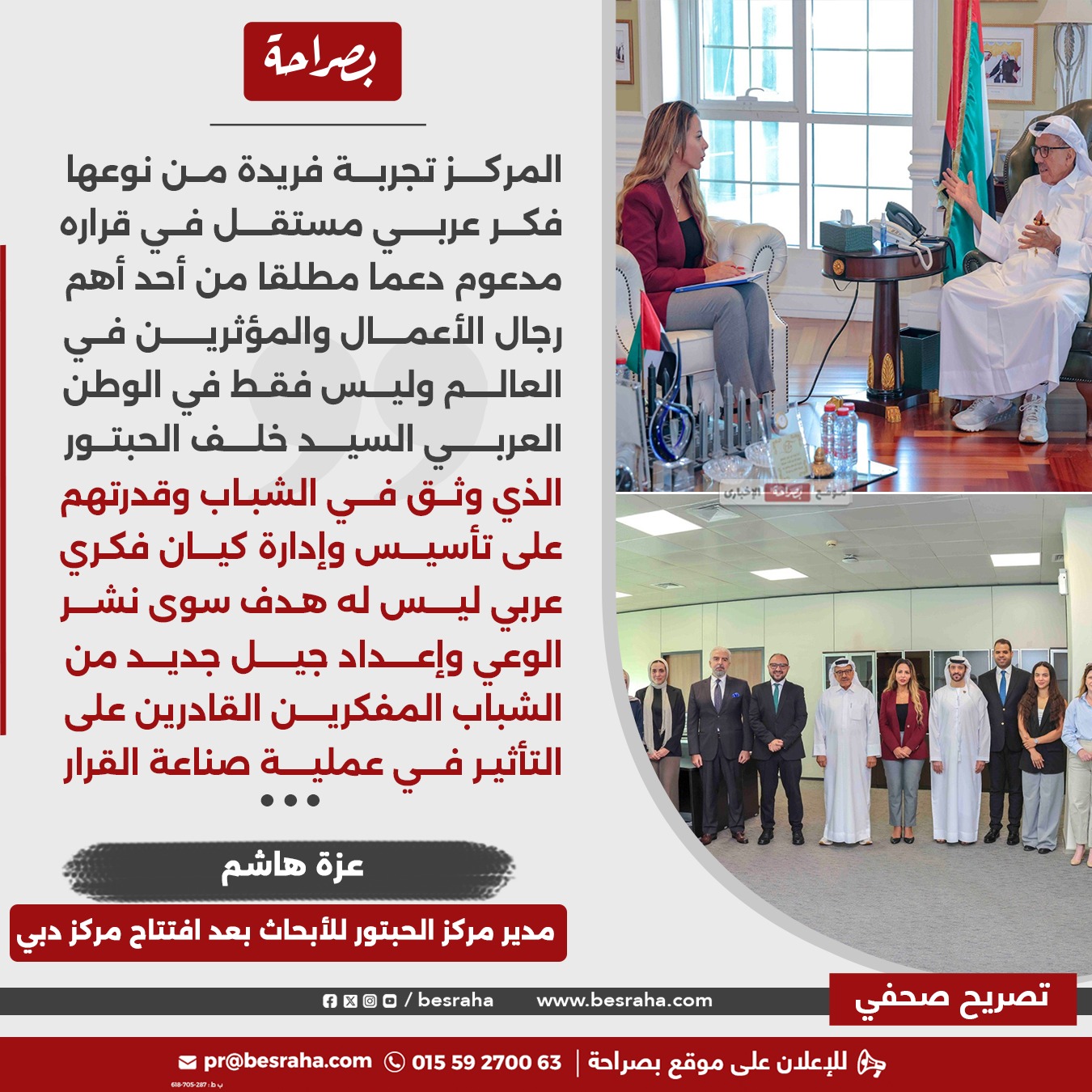 “مركز الحبتور للأبحاث هو تجربة فريدة من نوعها، مركز فكر عربي مستقل في قراره، مدعوم بشكل مطلق من أحد أبرز رجال الأعمال وأكثرهم تأثيرًا في العالم العربي، السيد خلف الحبتور. لقد آمن بقدرات الشباب، ومنحهم الثقة لتأسيس وإدارة كيان فكري لا هدف له سوى نشر الوعي، وإعداد جيل جديد من المفكرين القادرين على التأثير في عملية صناعة القرار في الوطن العربي.”