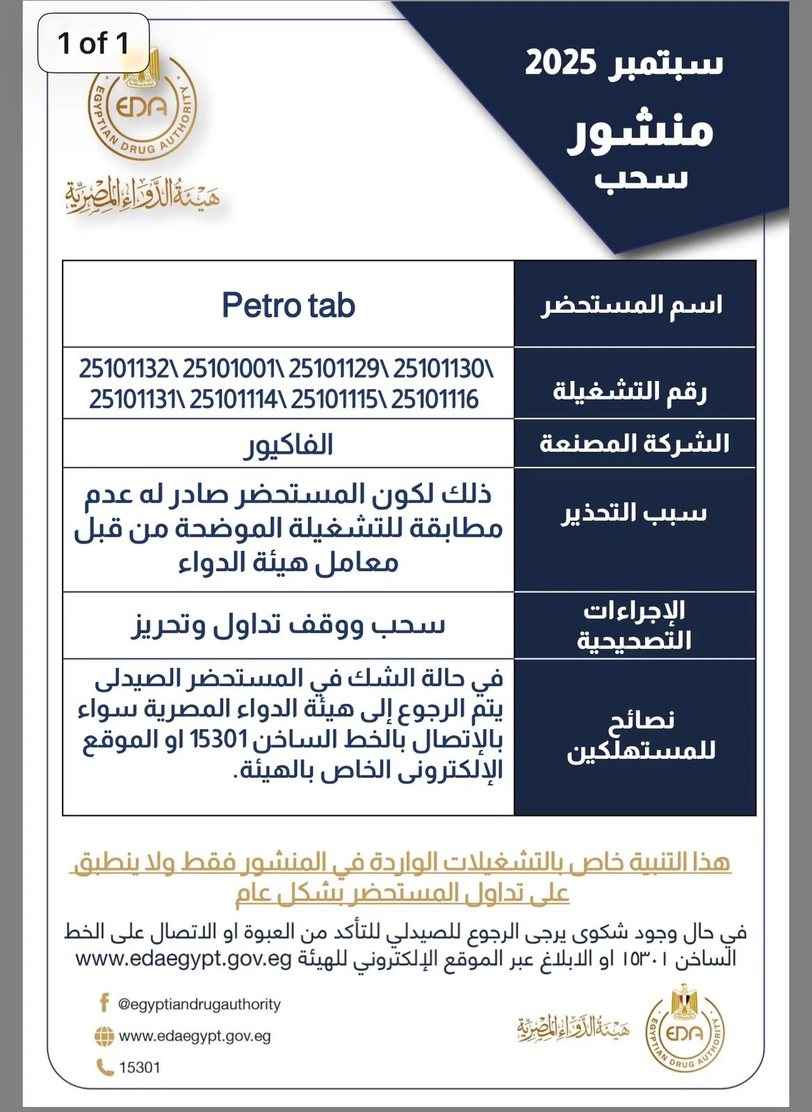 - المستحضر الحيوي PETRO TAB ويستخدم لتسكين الألم وخافض للحرارة.