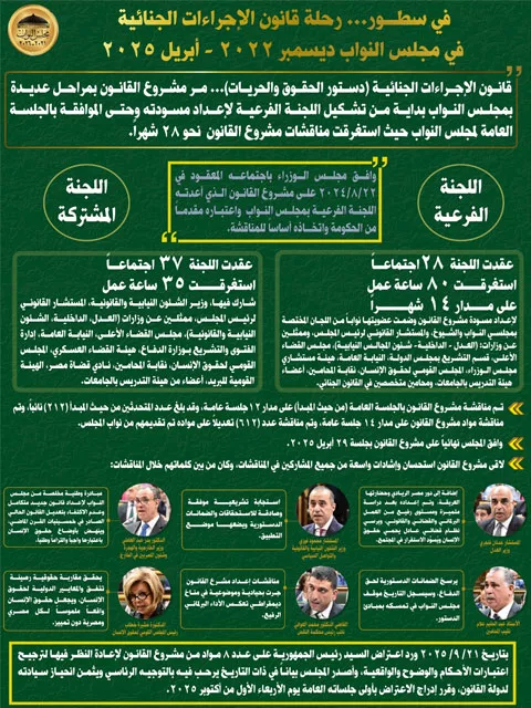 أصدر مجلس النواب بيانًا مفصلاً يستعرض رحلة مناقشة مشروع قانون الإجراءات الجنائية، التي استغرقت فترة طويلة داخل البرلمان، بدءًا من تشكيل اللجنة الفرعية لإعداد المسودة وحتى الموافقة النهائية عليه في أبريل 2025.
