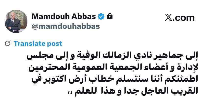 "إلى جماهير نادي الزمالك الوفية، وإلى مجلس الإدارة، وأعضاء الجمعية العمومية المحترمين.. أطمئنكم أننا سنتسلم خطاب أرض أكتوبر في القريب العاجل جدًا، وذلك للعلم".