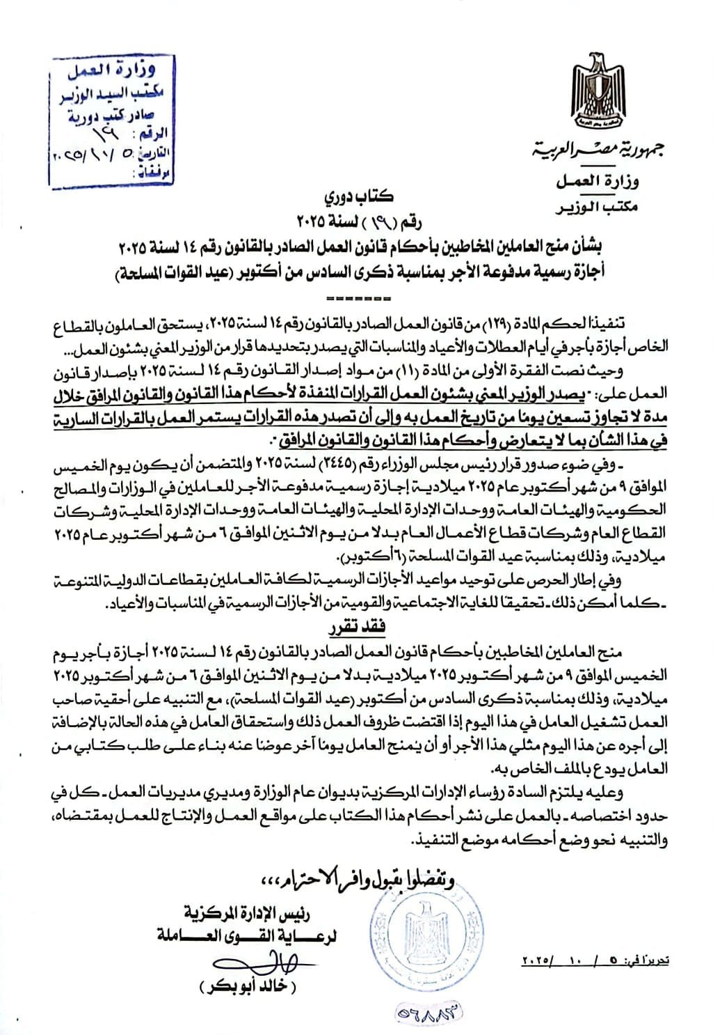 وقد أصدرت وزارة العمل اليوم الكتاب الدوري رقم (19) لسنة 2025 بشأن منح العاملين الخاضعين لأحكام قانون العمل إجازة رسمية مدفوعة الأجر بهذه المناسبة، تنفيذًا لحكم المادة (129) من قانون العمل، وحرصًا على توحيد مواعيد الإجازات الرسمية لكافة قطاعات الدولة تحقيقًا للغاية الاجتماعية والقومية منها... وشدد الوزير على ضرورة التزام رؤساء الإدارات المركزية بديوان عام الوزارة ومديري المديريات – كل في حدود اختصاصه – بنشر أحكام الكتاب والعمل بمقتضاها ووضعها موضع التنفيذ في مواقع العمل والإنتاج. وتقدَّم وزير العمل بأسمى التهاني إلى عمال وشعب مصر العظيم بمناسبة ذكرى انتصارات أكتوبر المجيدة، داعيًا الله أن يعيدها على وطننا الغالي بمزيد من الأمن والرخاء تحت قيادة فخامة الرئيس عبدالفتاح السيسي، رئيس الجمهورية.
