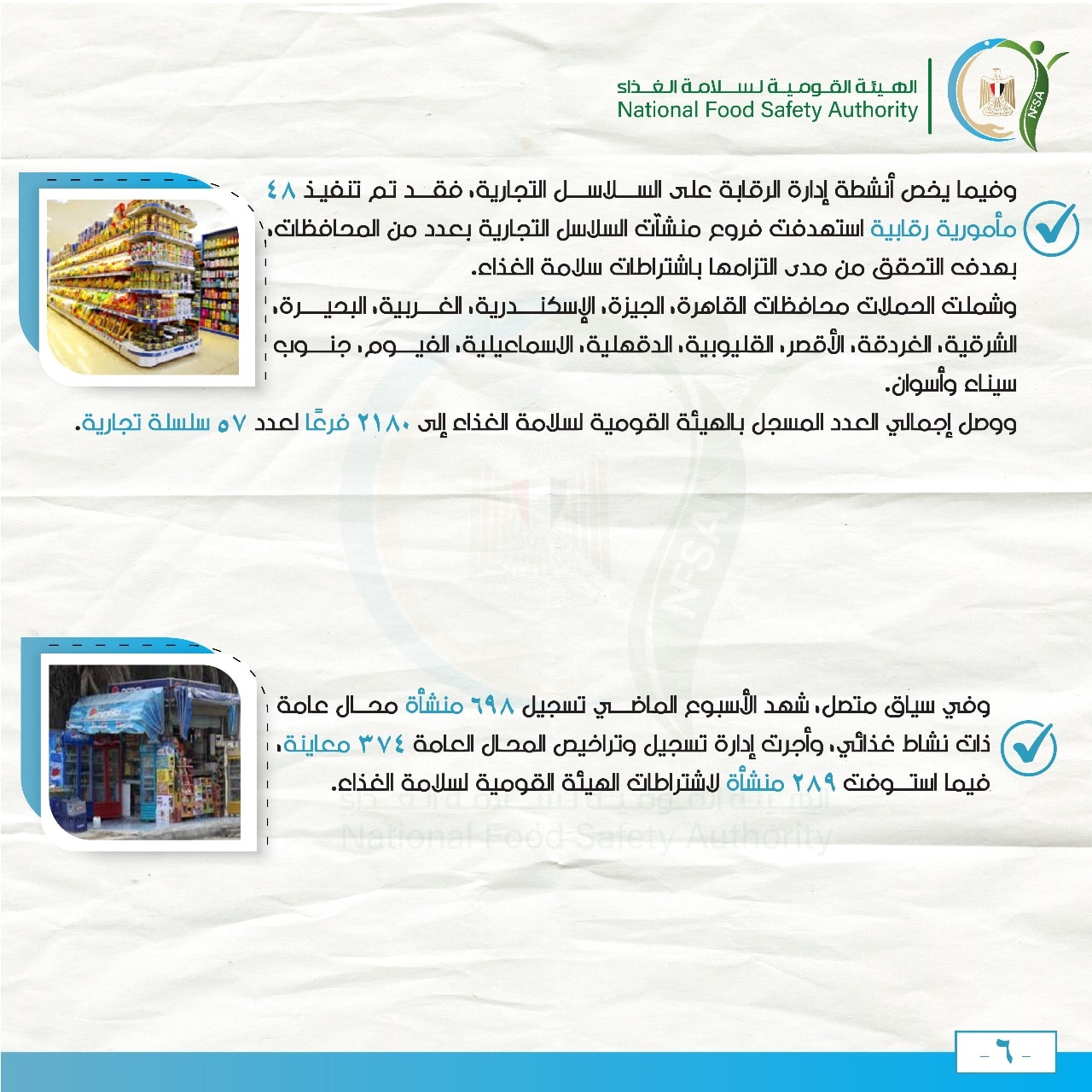 وفيما يخص أنشطة إدارة الرقابة على السلاسل التجارية، فقد تم تنفيذ 48 مأمورية رقابية استهدفت فروع منشآت السلاسل التجارية بعدد من المحافظات، بهدف التحقق من مدى التزامها باشتراطات سلامة الغذاء، وشملت الحملات محافظات القاهرة، الجيزة، الإسكندرية، الغربية، البحيرة، الشرقية، الغردقة، الأقصر، القليوبية، الدقهلية، الاسماعيلية، الفيوم، جنوب سيناء وأسوان.