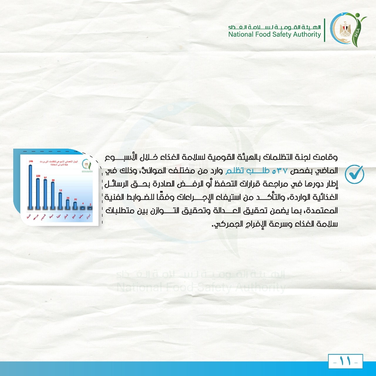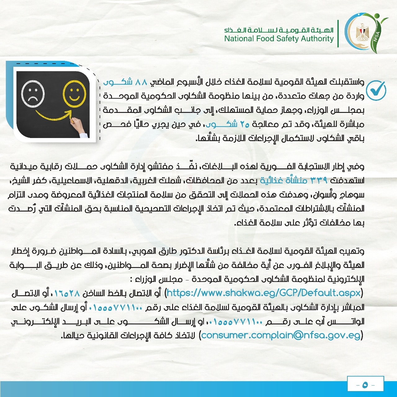 واستقبلت الهيئة القومية لسلامة الغذاء خلال الأسبوع الماضي 88 شكوى واردة من جهات متعددة، من بينها منظومة الشكاوى الحكومية الموحدة بمجلس الوزراء، وجهاز حماية المستهلك، إلى جانب الشكاوى المقدمة مباشرة للهيئة، وقد تم معالجة 25 شكوى، في حين يجري حاليًا فحص باقي الشكاوى لاستكمال الإجراءات اللازمة بشأنها.