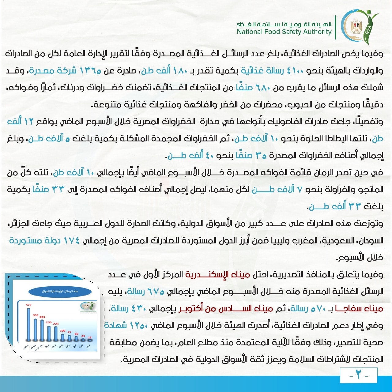 وفيما يتعلق بالمنافذ التصديرية، احتل ميناء الإسكندرية المركز الأول في عدد الرسائل الغذائية المصدرة منه خلال الأسبوع الماضي بإجمالي 675 رسالة، يليه ميناء سفاجا بـ 570 رسالة، ثم ميناء السادس من أكتوبر بإجمالي 430 رسالة.