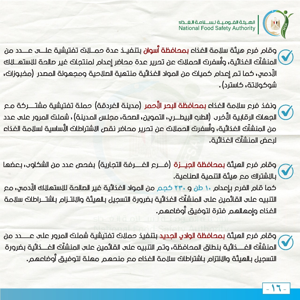 وقام فرع هيئة سلامة الغذاء بمحافظة أسوان بتنفيذ عدة حملات تفتيشية على عدد من المنشآت الغذائية، وأسفرت الحملات عن تحرير عدة محاضر إعدام لمنتجات غير صالحة للاستهلاك الآدمي، كما تم إعدام كميات من المواد الغذائية منتهية الصلاحية ومجهولة المصدر (مخبوزات، شوكولاتة، كاسترد).