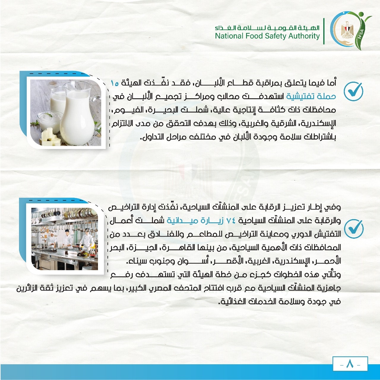 أما فيما يتعلق بمراقبة قطاع الألبان، فقد نفّذت الهيئة 15 حملة تفتيشية استهدفت محالب ومراكز تجميع الألبان في محافظات ذات كثافة إنتاجية عالية، شملت البحيرة، الفيوم، الإسكندرية، الشرقية والغربية، وذلك بهدف التحقق من مدى الالتزام باشتراطات سلامة وجودة الألبان في مختلف مراحل التداول.