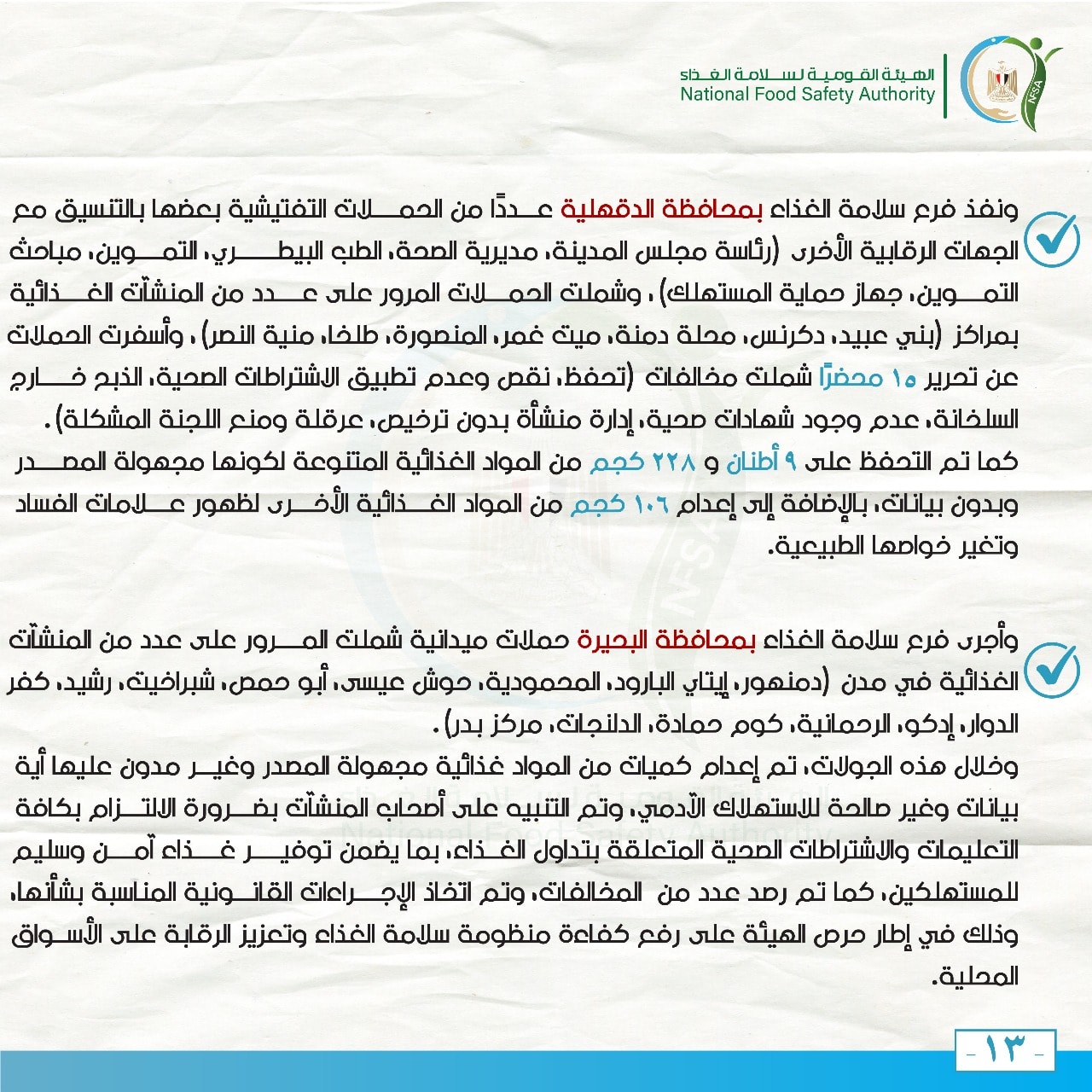 ونفذ فرع سلامة الغذاء بمحافظة الدقهلية عددًا من الحملات التفتيشية بعضها بالتنسيق مع الجهات الرقابية الأخرى (رئاسة مجلس المدينة، مديرية الصحة، الطب البيطري، التموين، مباحث التموين، جهاز حماية المستهلك)، وشملت الحملات المرور على عدد من المنشآت الغذائية بمراكز (بني عبيد، دكرنس، محلة دمنة، ميت غمر، المنصورة، طلخا، منية النصر)، وأسفرت الحملات عن تحرير 15 محضرًا شملت مخالفات (تحفظ، نقص وعدم تطبيق الاشتراطات الصحية، الذبح خارج السلخانة، عدم وجود شهادات صحية، إدارة منشأة بدون ترخيص، عرقلة ومنع اللجنة المشكلة).