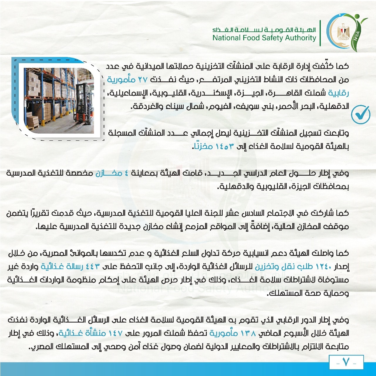 وتابعت تسجيل المنشآت التخزينية ليصل إجمالي عدد المنشآت المسجلة بالهيئة القومية لسلامة الغذاء إلى 1453 مخزنًا.