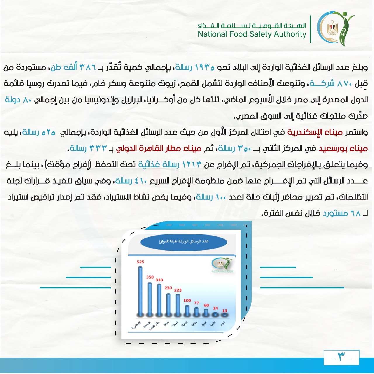 واستمر ميناء الإسكندرية في احتلال المركز الأول من حيث عدد الرسائل الغذائية الواردة، بإجمالي 525 رسالة، يليه ميناء بورسعيد في المركز الثاني بـــ 350 رسالة، ثم ميناء مطار القاهرة الدولي بـ 333 رسالة.
