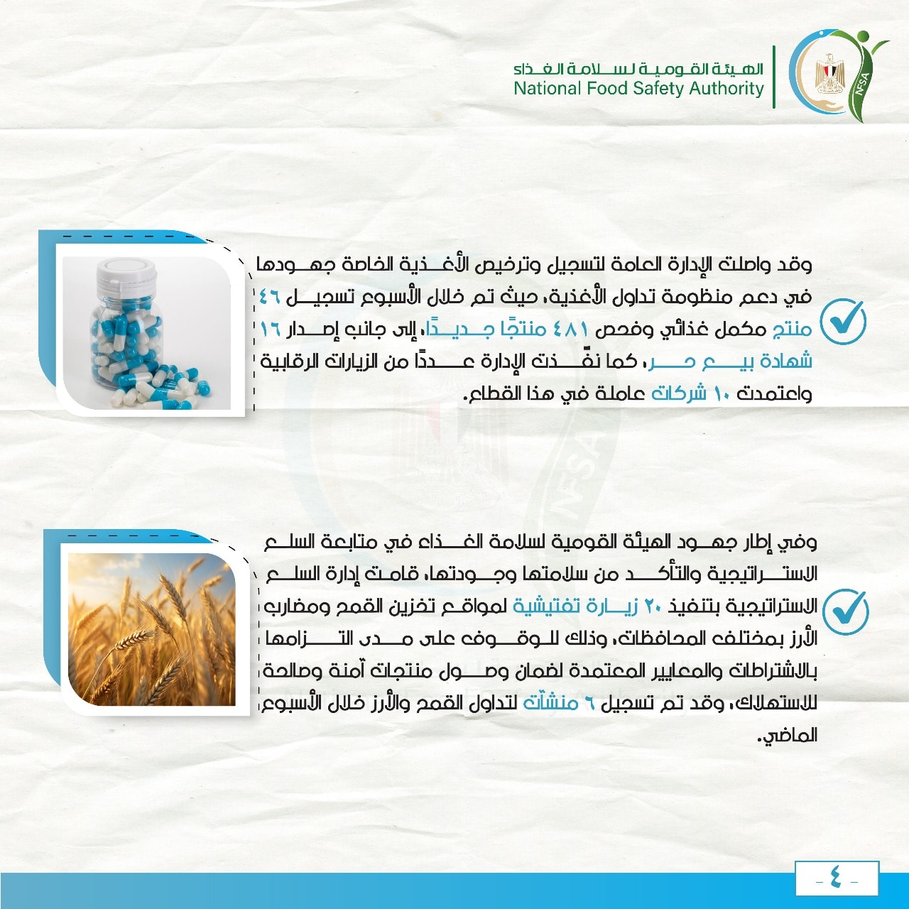 وقد واصلت الإدارة العامة لتسجيل وترخيص الأغذية الخاصة جهودها في دعم منظومة تداول الأغذية، حيث تم خلال الأسبوع تسجيل 46 منتج مكمل غذائي وفحص 481 منتجًا جديدًا، إلى جانب إصدار 16 شهادة بيع حر، كما نفّذت الإدارة عددًا من الزيارات الرقابية واعتمدت 10 شركات عاملة في هذا القطاع.