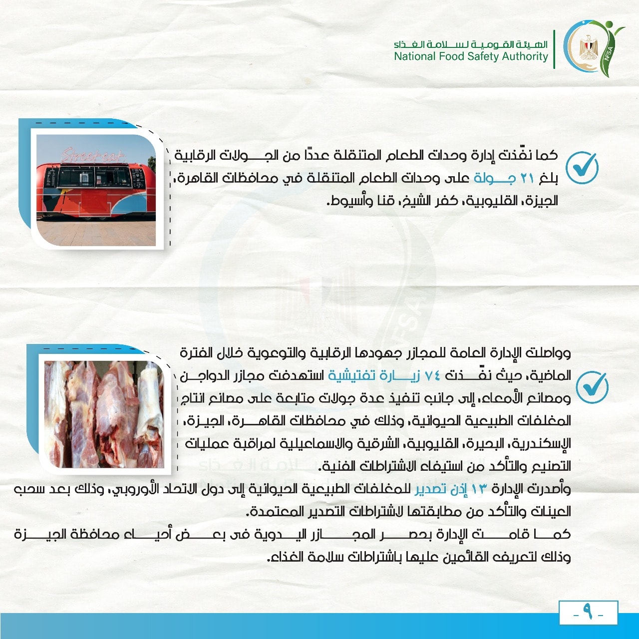 كما نفّذت إدارة وحدات الطعام المتنقلة عددًا من الجولات الرقابية بلغ 21 جولة على وحدات الطعام المتنقلة في محافظات القاهرة، الجيزة، القليوبية، كفر الشيخ، قنا وأسيوط.