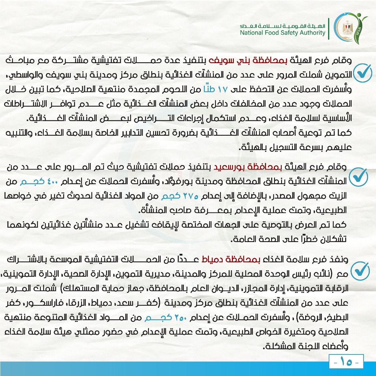 وقام فرع الهيئة بمحافظة بني سويف بتنفيذ عدة حملات تفتيشية مشتركة مع مباحث التموين شملت المرور على عدد من المنشآت الغذائية بنطاق مركز ومدينة بني سويف والواسطي، وأسفرت الحملات عن التحفظ على 17 طنًا من اللحوم المجمدة منتهية الصلاحية، كما تبين خلال الحملات وجود عدد من المخالفات داخل بعض المنشآت الغذائية مثل عدم توافر الاشتراطات الأساسية لسلامة الغذاء، وعدم استكمال إجراءات التراخيص لبعض المنشآت الغذائية.