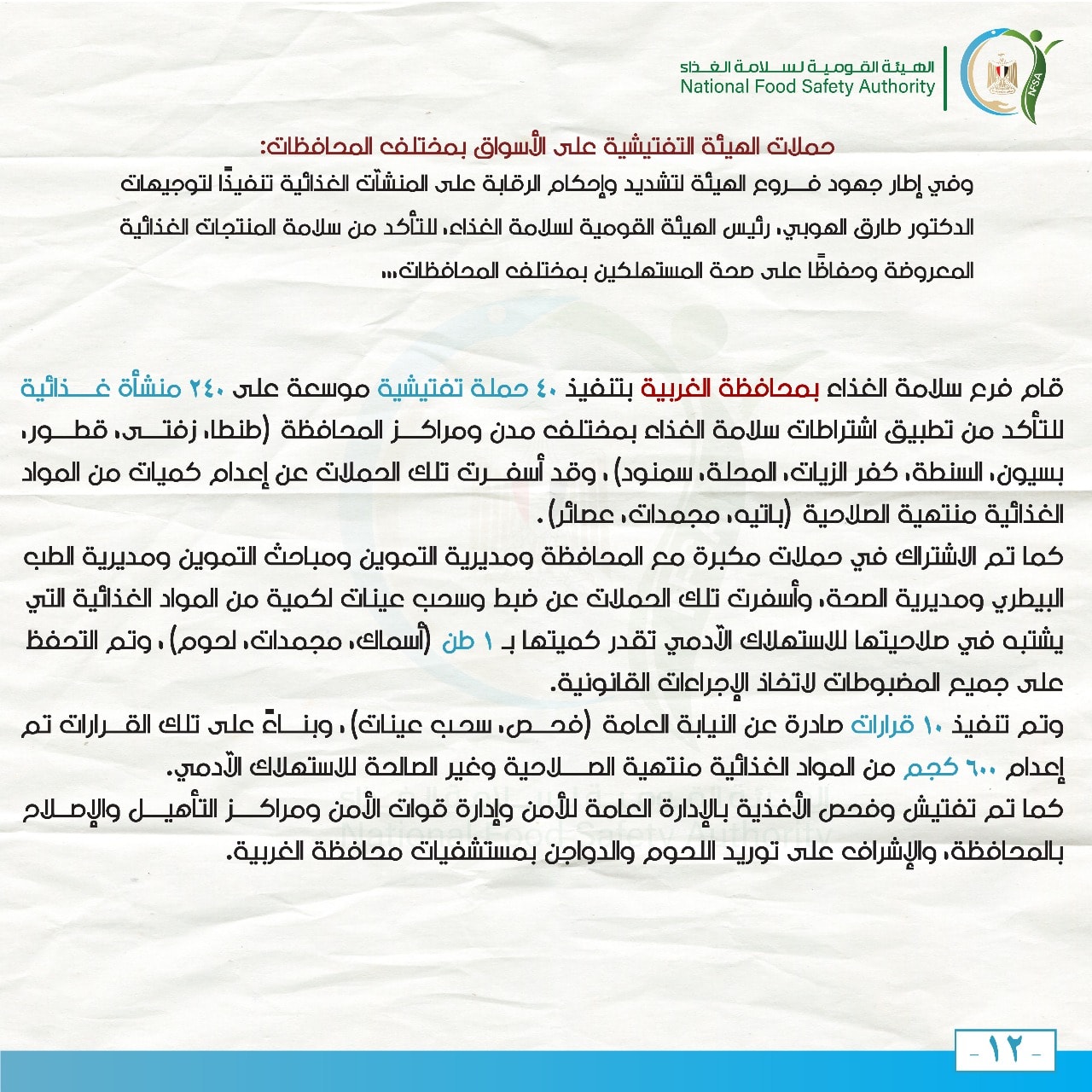 قام فرع سلامة الغذاء بمحافظة الغربية بتنفيذ 40 حملة تفتيشية موسعة على 240 منشأة غذائية للتأكد من تطبيق اشتراطات سلامة الغذاء بمختلف مدن ومراكز المحافظة (طنطا، زفتى، قطور، بسيون، السنطة، كفر الزيات، المحلة، سمنود)، وقد أسفرت تلك الحملات عن إعدام كميات من المواد الغذائية منتهية الصلاحية (باتيه، مجمدات، عصائر).