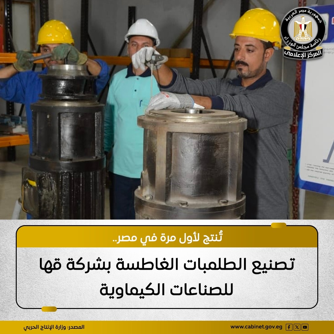في خطوة جديدة نحو توطين الصناعات الحيوية، أعلنت شركة قها للصناعات الكيماوية التابعة لوزارة الإنتاج الحربي عن بدء إنتاج الطلمبات الغاطسة لأول مرة في مصر، والتي تُستخدم في محطات الرفع والمعالجة لمياه الصرف الصحي، وخزانات ومحطات مياه الشرب.