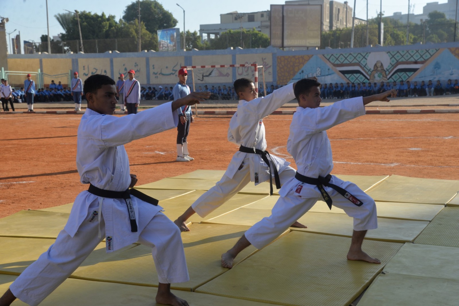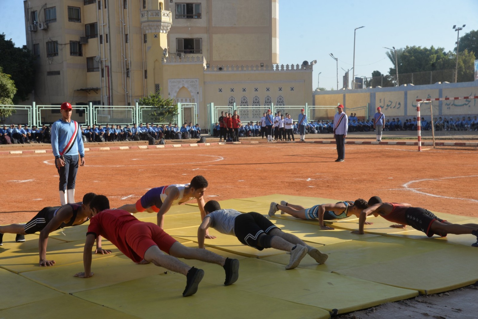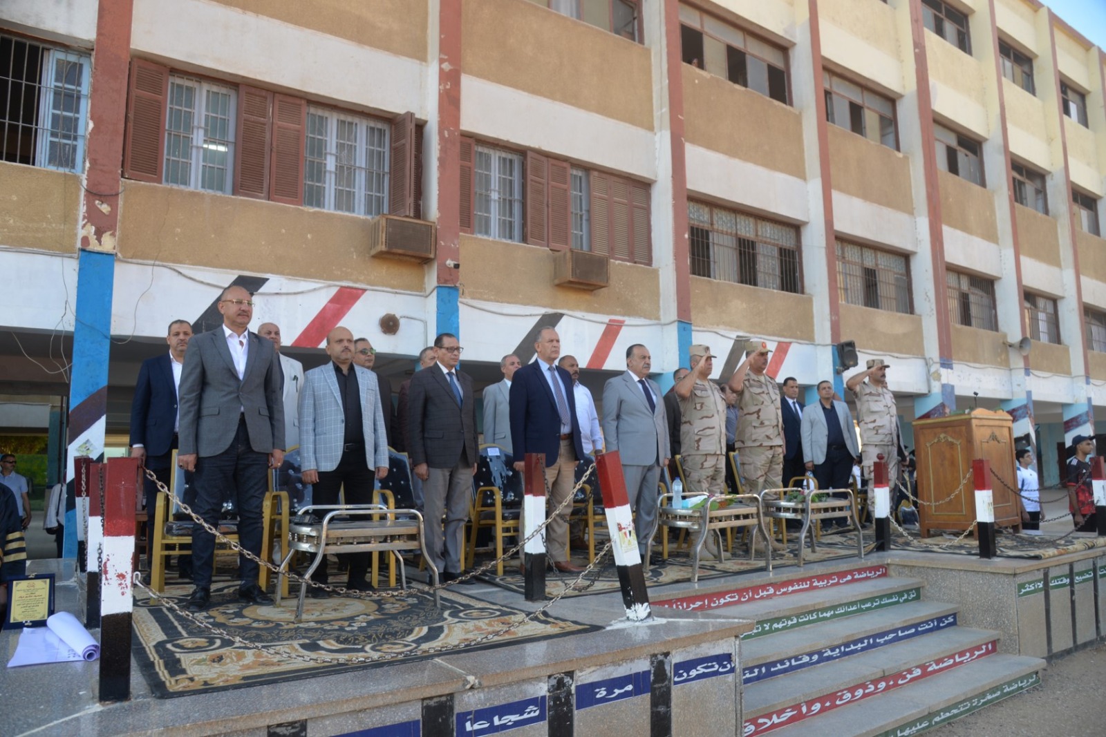 بدأت المراسم بعزف السلام الوطني لجمهورية مصر العربية، ثم توجه المحافظ والقيادات لوضع إكليل الزهور على النصب التذكاري للشهداء، وقراءة الفاتحة ترحمًا على أرواحهم الطاهرة. وعقب ذلك، قدمت الموسيقى العسكرية معزوفات وطنية جسدت روح النصر، لتنطلق بعدها العروض الرياضية والعسكرية المتقنة التي قدمها طلاب المدرسة، وشملت فقرات للكاراتيه والمصارعة واللياقة البدنية، والتي عكست مستوى عالٍ من الانضباط والتدريب.