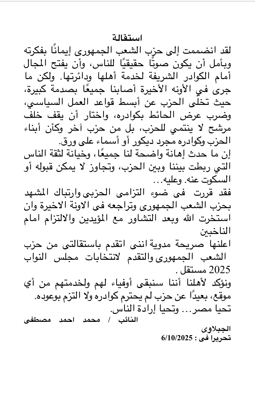 أعلن النائب محمد الجبلاوي، عضو مجلس النواب عن حزب الشعب الجمهوري بمحافظة قنا، استقالته من الحزب مساء اليوم الاثنين، وذلك عقب ترشيح الحزب لآخرين في دائرته الانتخابية.