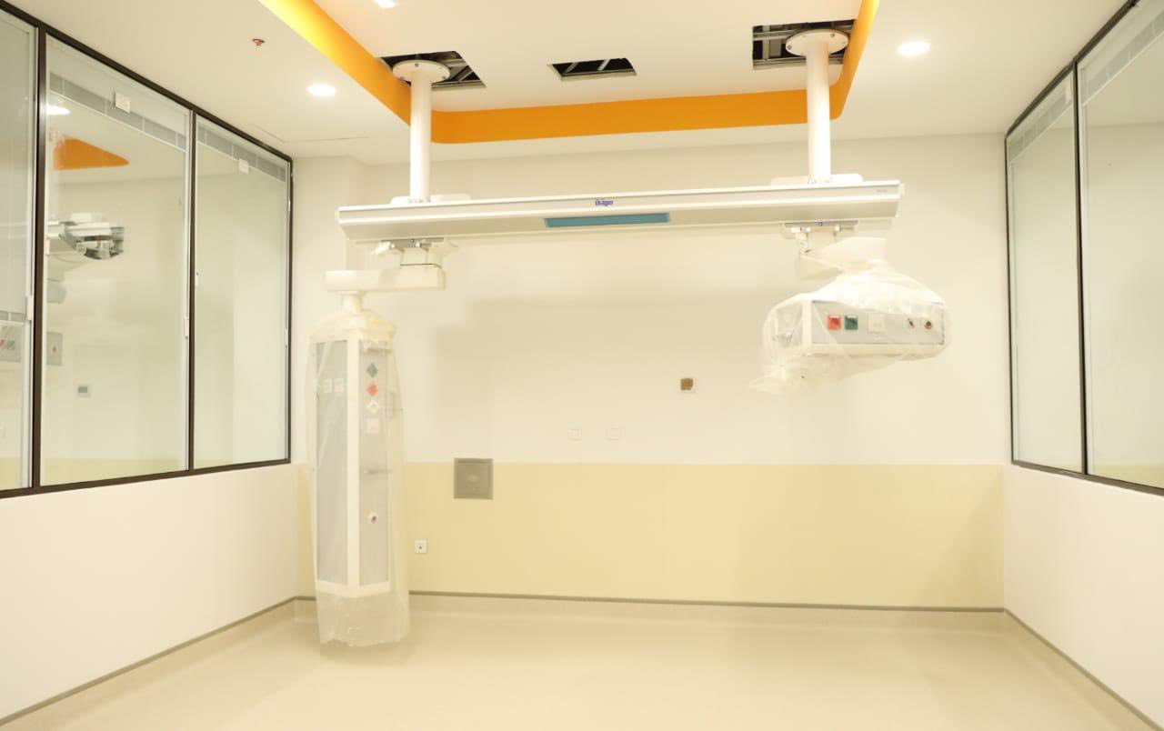 ويتميز بتصميمه المتكامل، حيث يشمل الطابق السفلي المغسلة والمطبخ ووحدات التعقيم والمخازن، بينما يضم الطابق الأرضي الاستقبال والعيادات الخارجية والمركز البحثي ووحدة الأشعة والصيدلية، أما الطابق الأول فيضم وحدات العمليات والقسطرة والعناية المركزة، والطابق الثاني مخصص لغرف المرضى الداخليين، مما يعكس تكامل خدمات الرعاية والتدريب والبحث في منظومة طبية شاملة.