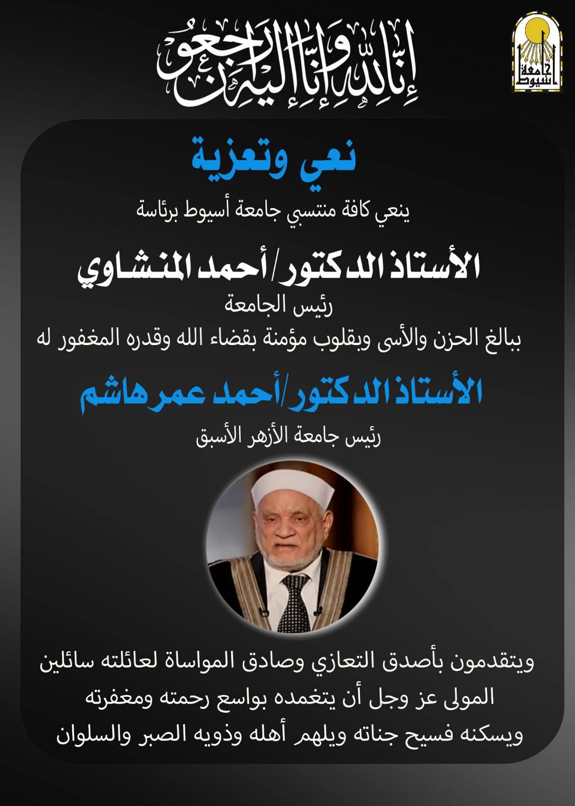 رئيس جامعة أسيوط ينعى الدكتور أحمد عمر هاشم: ترك إرثًا من الوسطية والتسامح سيلهم الأجيال