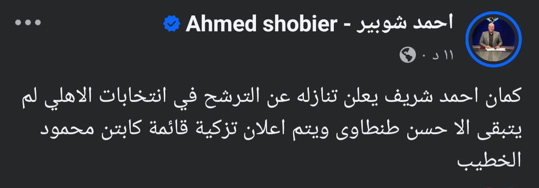 أعلن الإعلامي “ أحمد شوبير ” عبر صفحة الشخصية فيس بوك قرار إنسحاب أحمد شريف من إنتخابات النادي الأهلي المقرر إقامتها يومي 30 _31 من شهر أكتوبر الجاري ؛ تحدث أن القائمة لا يوجد فيها سوي حسن طنطاوي .
