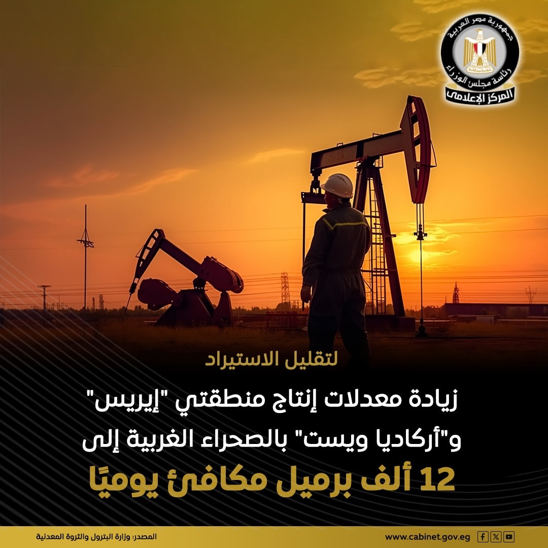 أعلنت وزارة البترول والثروة المعدنية عن نجاح شركة عجيبة للبترول في زيادة معدلات منطقتى "إيريس" و"أركاديا ويست" بالصحراء الغربية إلى 12 ألف برميل مكافئ يوميًا، بعد ربط البئر "إيريس-5" على الإنتاج مؤخرًا بمعدل 2000 برميل يوميًا.