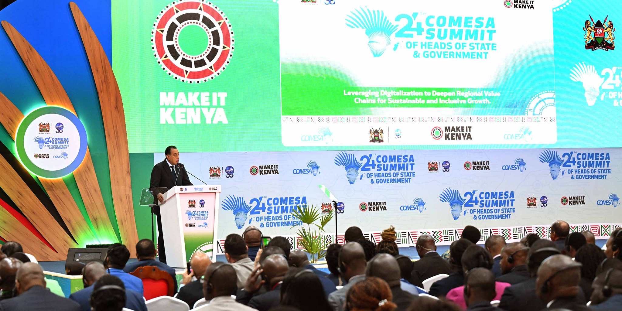وفي بداية كلمته قال رئيس الوزراء: يُسعدني في البداية أن أنْقِل لكم تحيات فخامة السيد الرئيس عبد الفتاح السيسي، رئيس جمهورية مصر العربية، الذي يُثمّن انعقاد القمة الرابعة والعشرين للكوميسا في العاصمة الكينية نيروبي، ويُؤكد دعمه الكامل لأهداف تجمع الكوميسا، كما يبعث إليكم بخالص تمنياته بنجاح أعمال القمة في تحقيق ما تصبو إليه شُعوبُنا من رفاهية وتقدم.