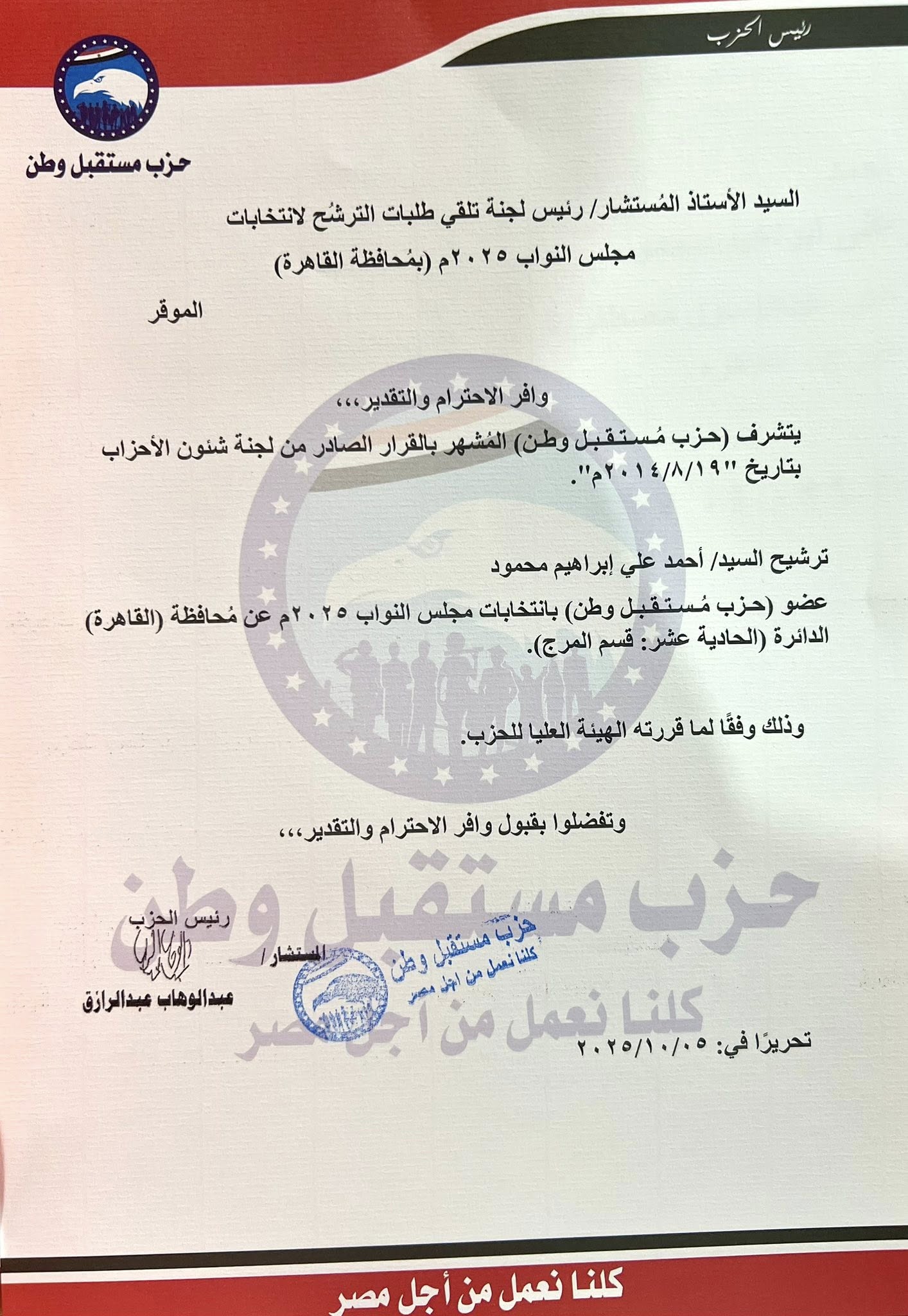 وأكد المرشح أن ترشحه يأتي في إطار دعم جهود الدولة في بناء الجمهورية الجديدة، ومواصلة مسيرة حزب مستقبل وطن في تمكين الشباب وتفعيل المشاركة السياسية الفاعلة، مشيرًا إلى أن المرحلة المقبلة تتطلب تكاتف الجميع لمواصلة الإنجازات وتعزيز التواصل المباشر مع المواطنين لحل مشكلاتهم وتلبية احتياجاتهم.