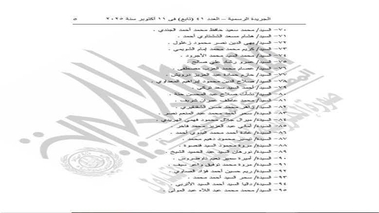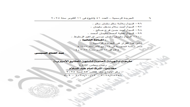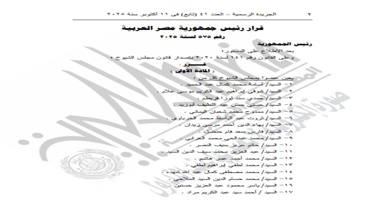نشرت الجريدة الرسمية قرار رئيس جمهورية مصر العربية رقم 575 لسنة 2025، بشأن تعيين 100 شخص أعضاء في مجلس الشيوخ، في العدد 41 تابع في 11 أكتوبر 2025.