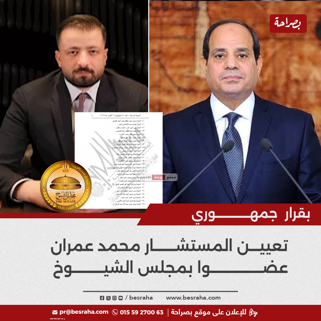 أصدر الرئيس عبد الفتاح السيسي، صباح اليوم، قرارًا بتعيين ١٠٠ عضو بمجلس الشيوخ ومنهم المستشار محمد عمران، أمين شباب حزب الجبهة، عضوًا بمجلس الشيوخ ضمن قائمة الأعضاء المعينين.