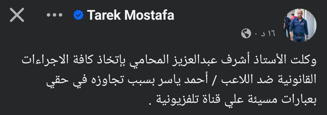 نشر طارق مصطفى عبر حسابه الخاص فيسبوك أنه وكل الأستاذ أشرف عبد العزيز، المحامي بالنقض، لاتخاذ كافة الإجراءات القانونية ضد اللاعب أحمد ياسر، بسبب ما وصفه بـ"تجاوزات وعبارات مسيئة في حقي عبر قناة تلفزيونية".