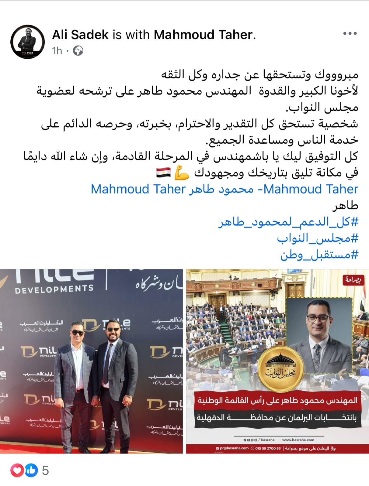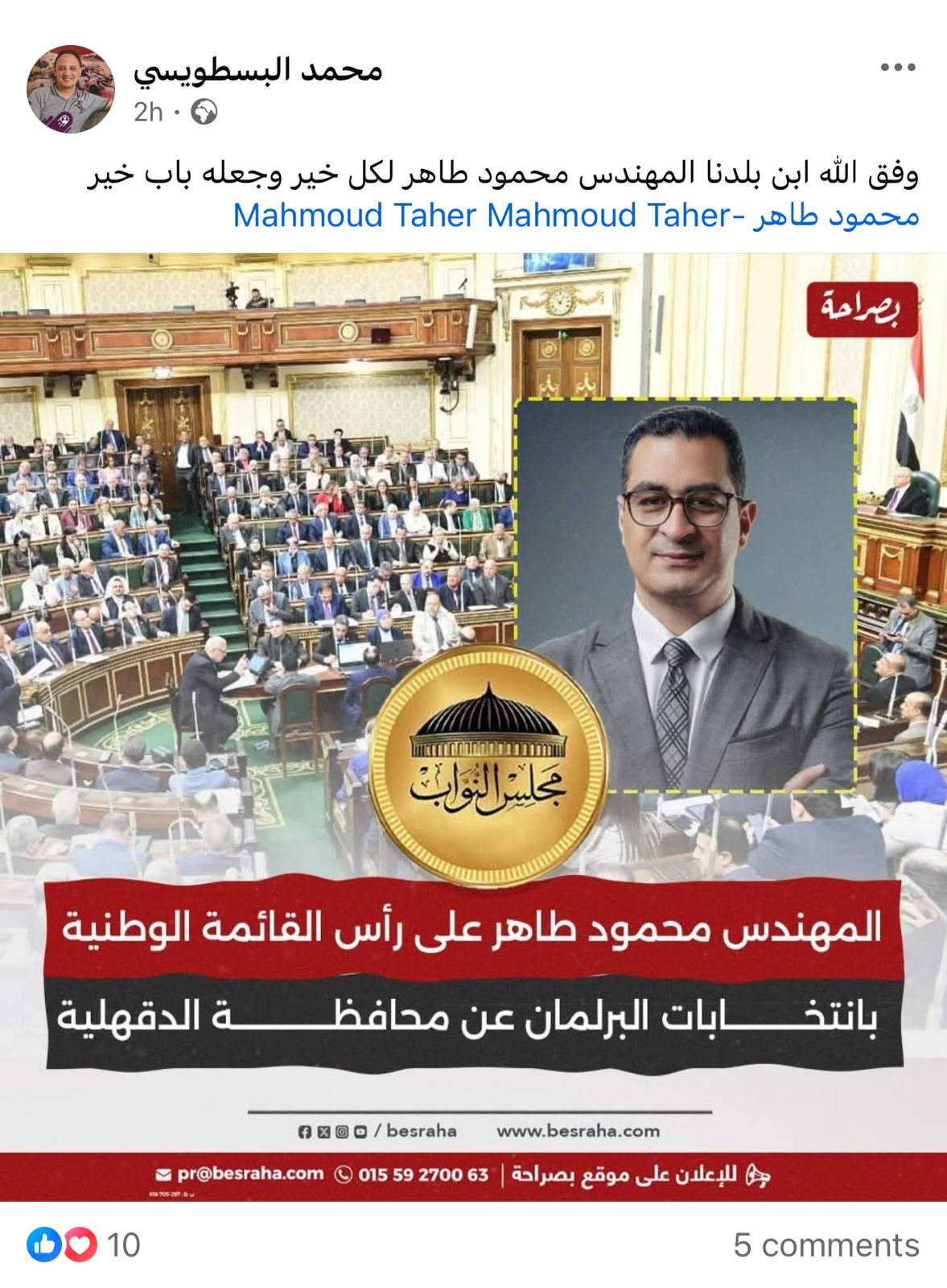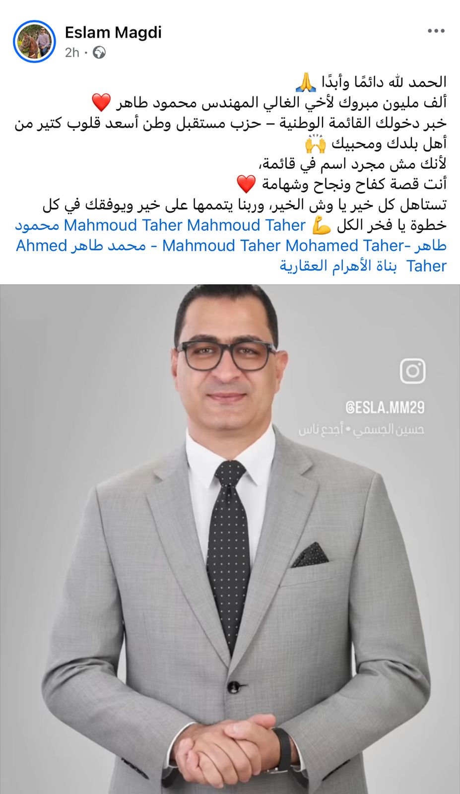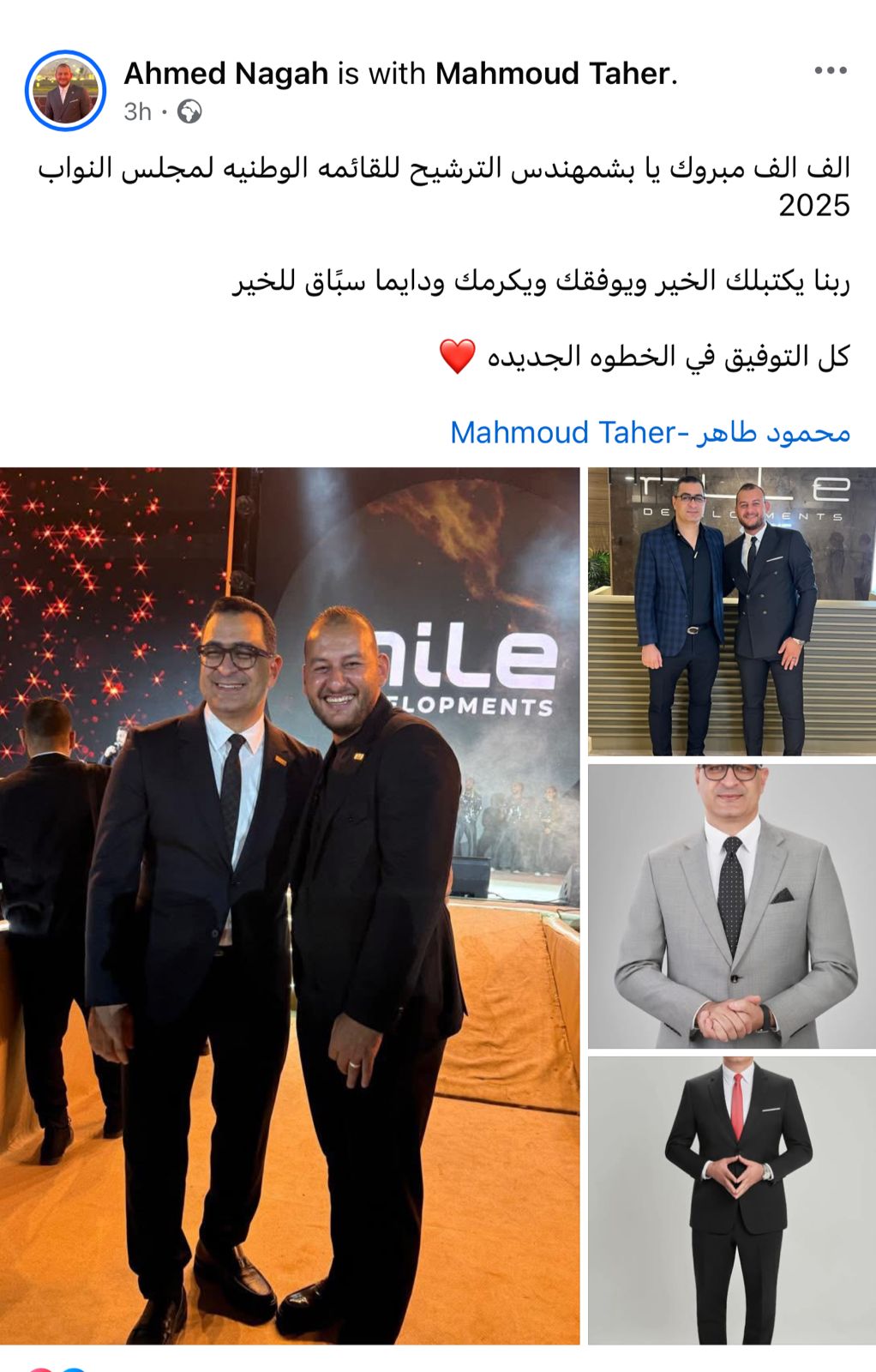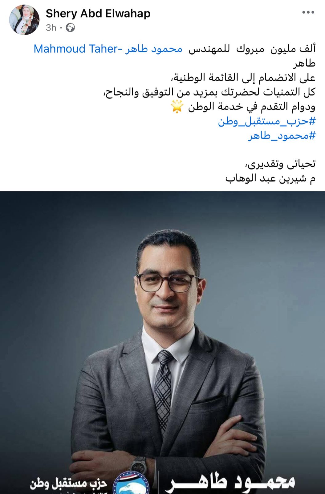 وتوالت منشورات التهنئة، عبر مواقع التواصل الاجتماعي للمهندس محمود طاهر، بعد ترشحه في القائمة الوطنية، وتواجده بشكل رسمي في مجلس النواب القادم.
