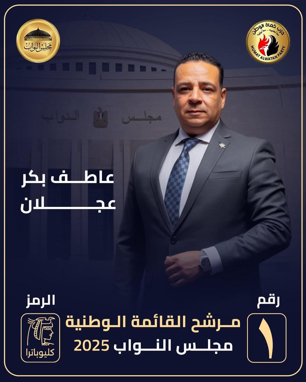 تقدم رجل الأعمال عاطف بكر عجلان رئيس مجلس إدارة شركة ناشيونال إيجيبت للسياحة وعضو حزب حماة الوطن ، بأوراق ترشحه لمجلس النواب ضمن القائمة الوطنية من أجل مصر عن محافظة كفر الشيخ .