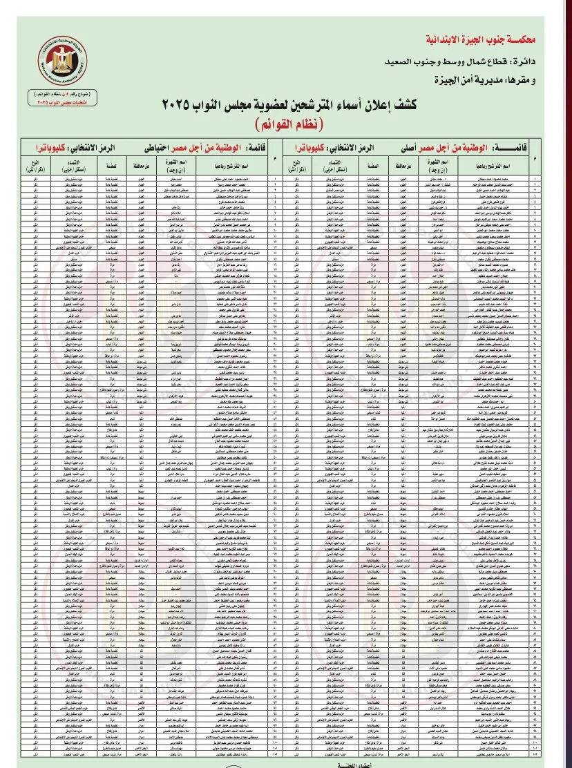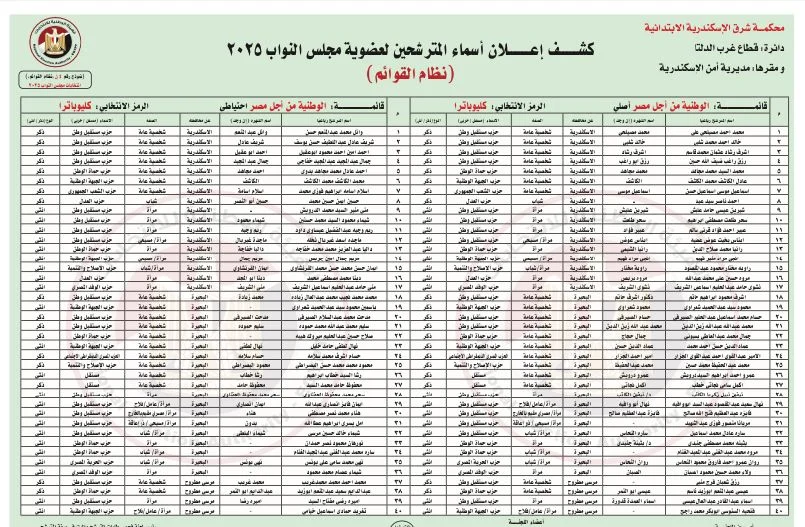 شملت القائمة 40 مرشحًا أساسيًا و40 احتياطيًا عن قطاع شرق الدلتا، و102 مرشحًا أساسيًا و102 احتياطيًا عن قطاع القاهرة وجنوب ووسط الدلتا، و102 مرشحًا أساسيًا و102 احتياطيًا عن قطاع شمال ووسط وجنوب الصعيد، بالإضافة إلى 40 مرشحًا أساسيًا و40 احتياطيًا عن قطاع غرب الدلتا.
