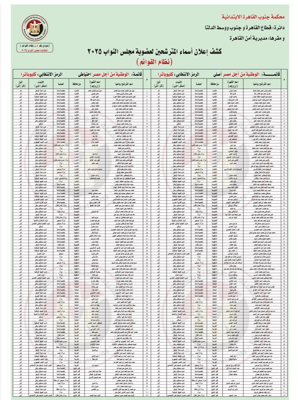 أعلنت الهيئة الوطنية للانتخابات، اليوم الخميس 16 أكتوبر، عن القائمة المبدئية لأسماء المرشحين لانتخابات مجلس النواب على مستوى الجمهورية، عن القائمة الوطنية من أجل مصر، والتي تحمل رمز "كليوباترا".