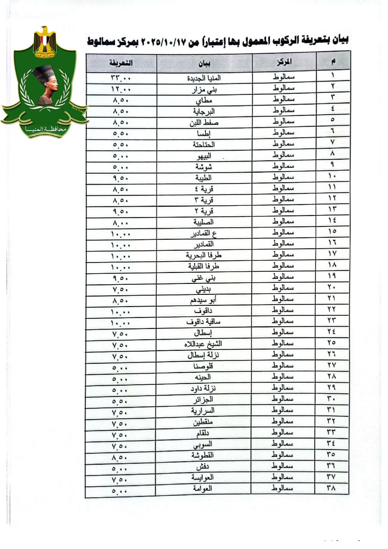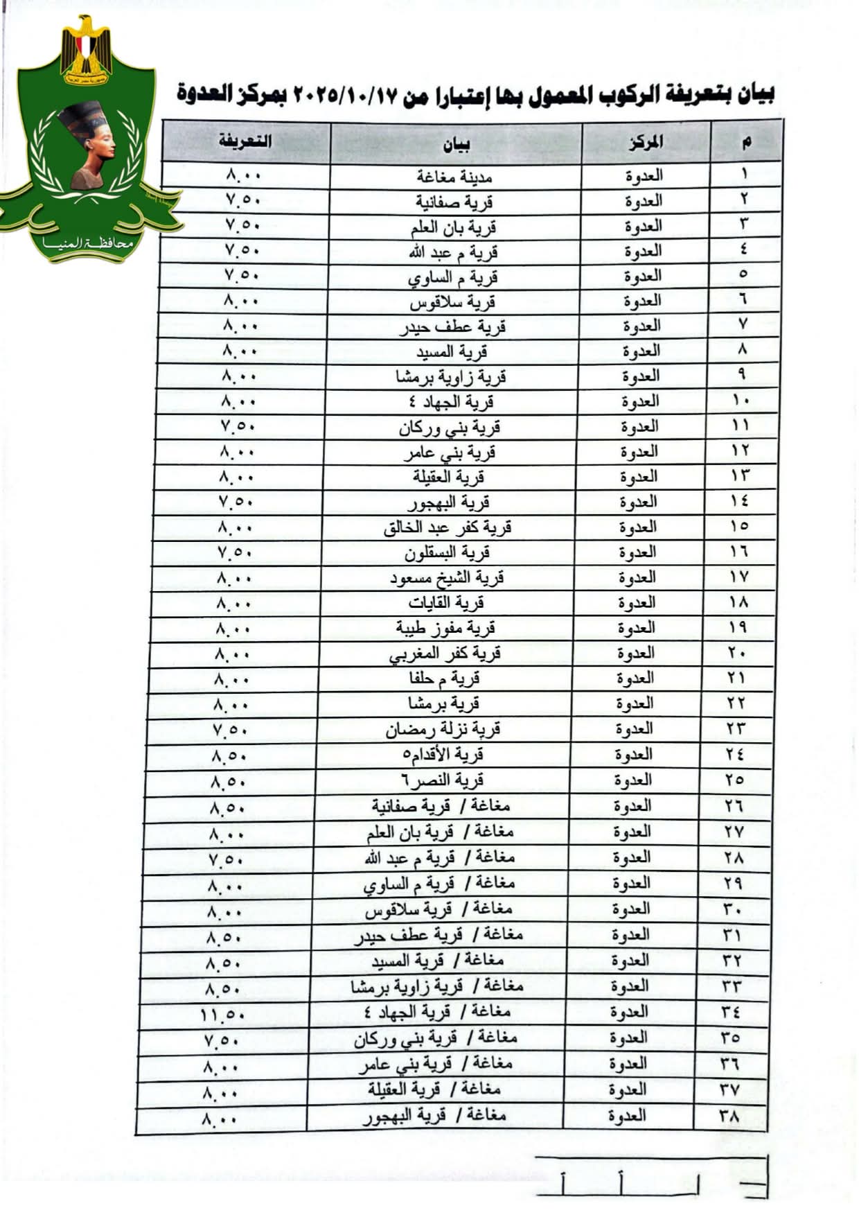 اعتمد اللواء عماد كدواني، محافظ المنيا، اليوم الجمعة الموافق 17 أكتوبر، تعريفة الركوب الجديدة لوسائل المواصلات الداخلية والخارجية، وذلك عقب قرار تحريك أسعار المواد البترولية.
