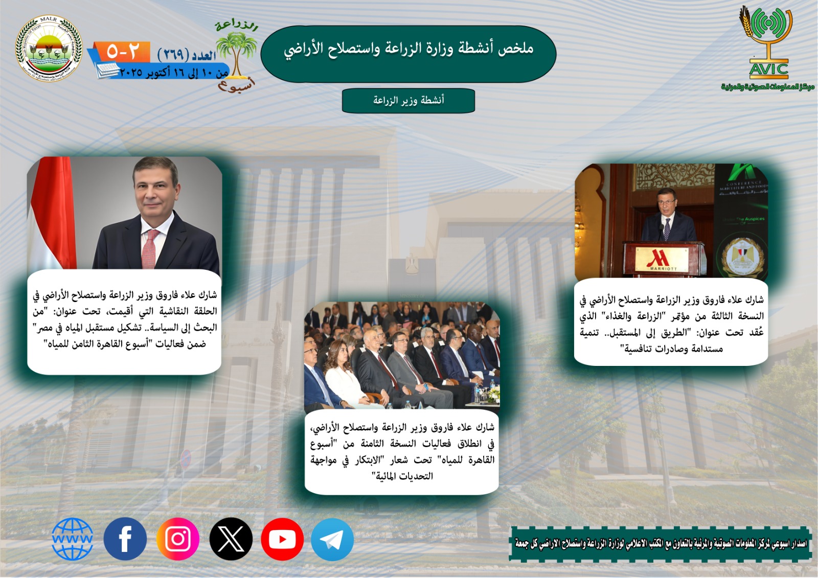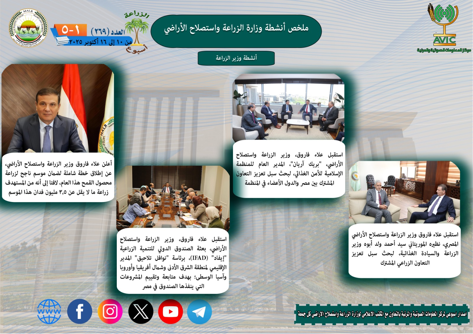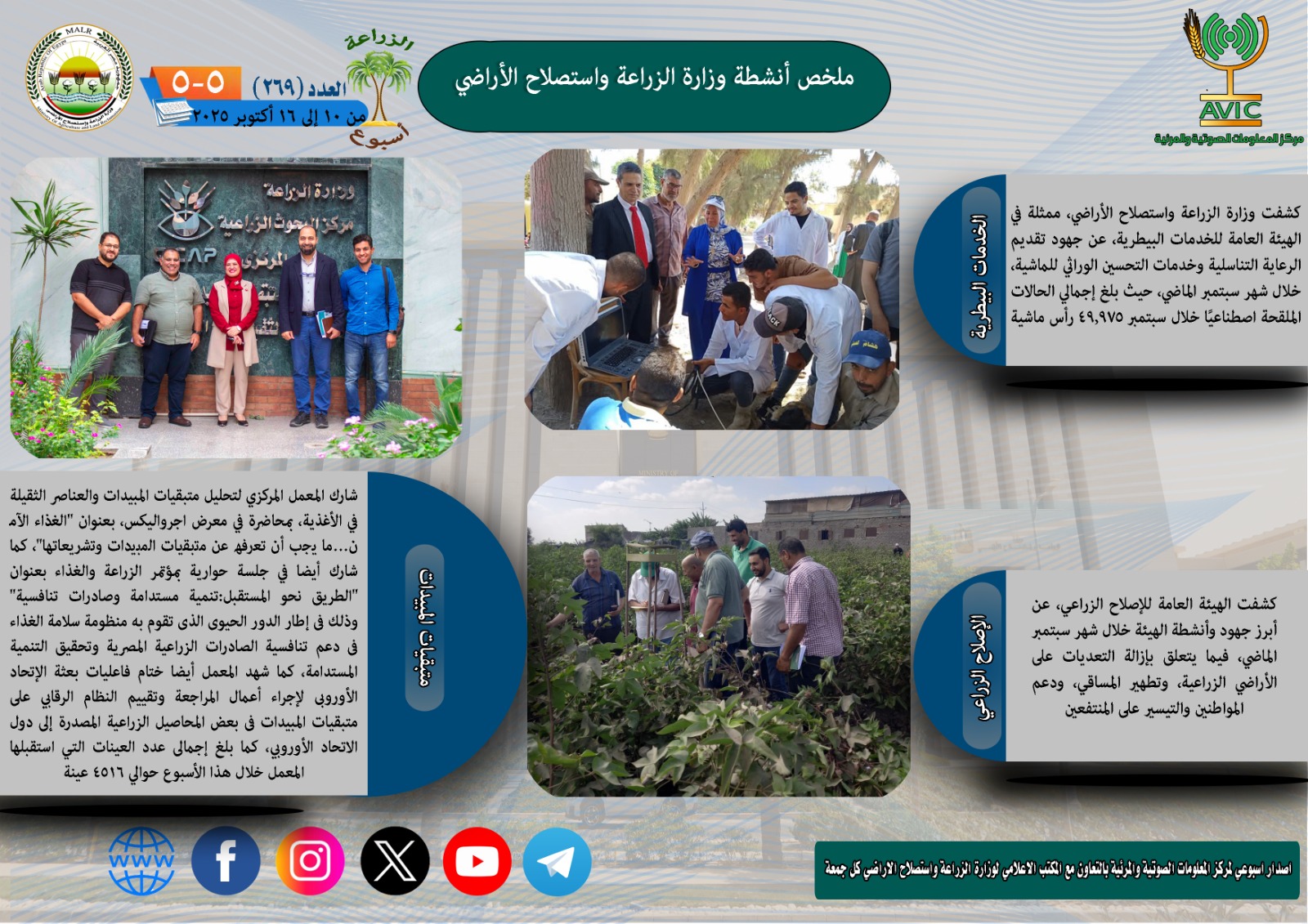 أصدر مركز المعلومات الصوتية والمرئية بوزارة الزراعة واستصلاح الأراضي، "الانفوجراف الاسبوعي" في نسخته رقم 269 حول الحصاد الاسبوعي لأهم أنشطة الوزارة، خلال الاسبوع الماضي في الفترة من 10 وحتى 16 أكتوبر الجاري، كما أصدر المركز ايضا ملخصا بالفيديو، حول انشطة الوزارة خلال نفس الفترة.