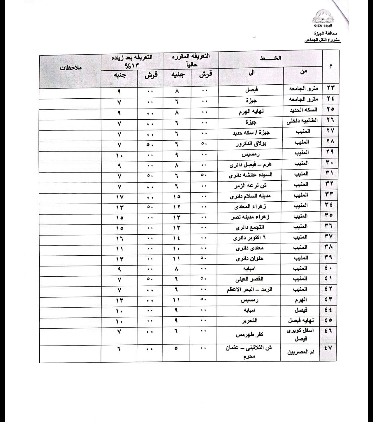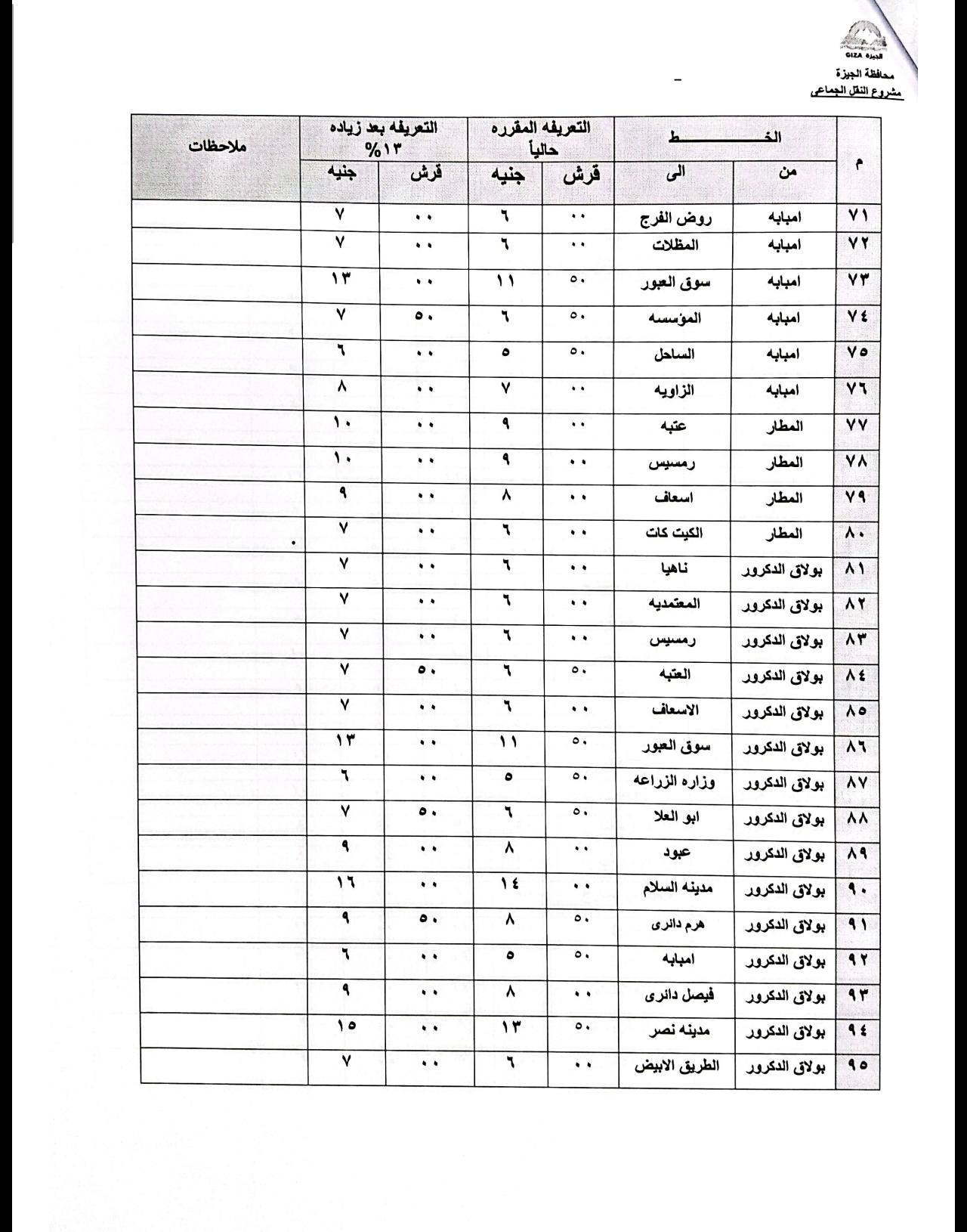 محافظة الجيزة : تعريفات السرفيس والنقل الجماعي للخطوط الداخلي