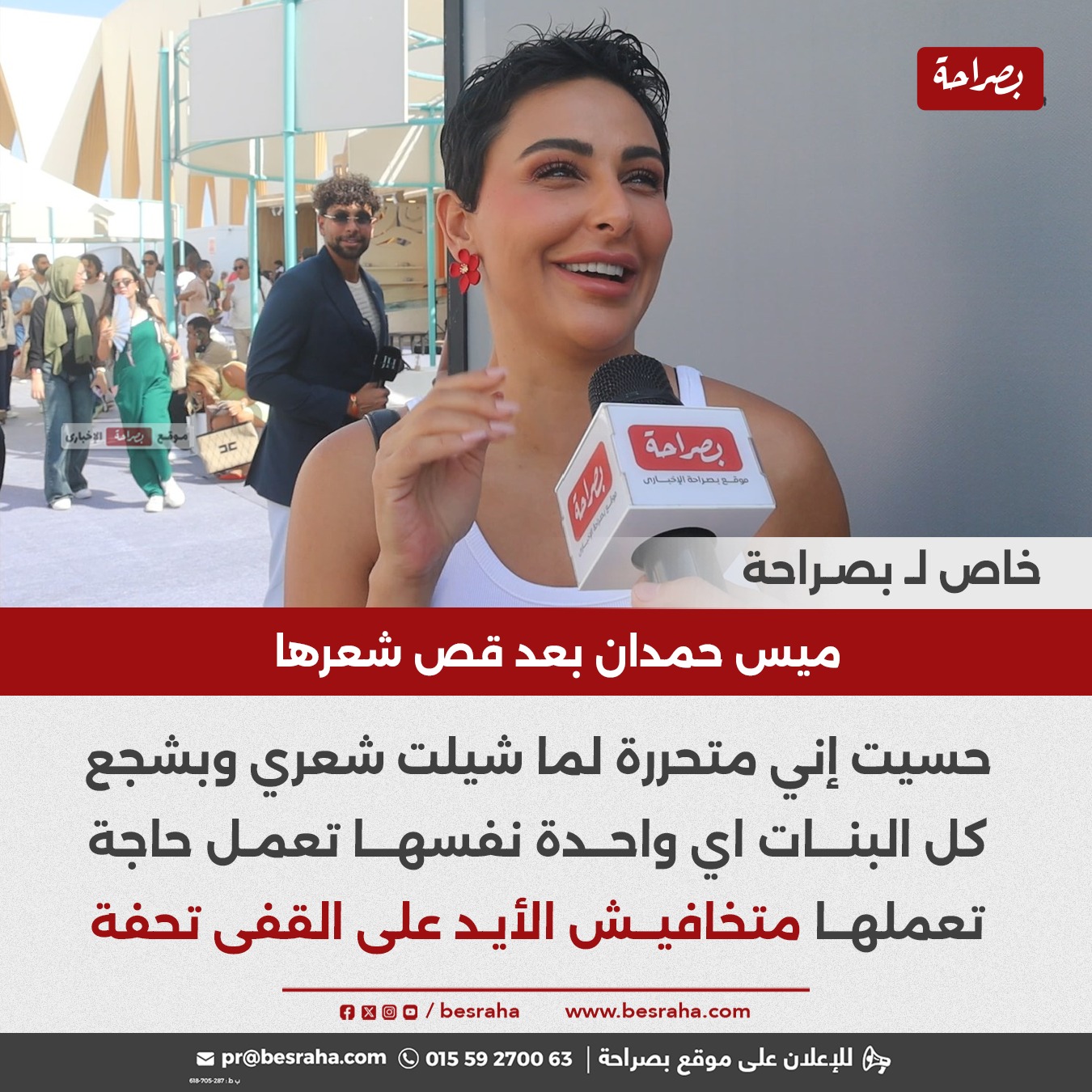 كشفت الفنانة ميس حمدان عن سبب خطوة قص شعرها مؤخرًا، مؤكدة أن التجربة منحتها شعورًا قويًا بالتحرر والثقة، وذلك في تصريح خاص لـ «بصراحة» على هامش فعاليات مهرجان الجونة السينمائي.