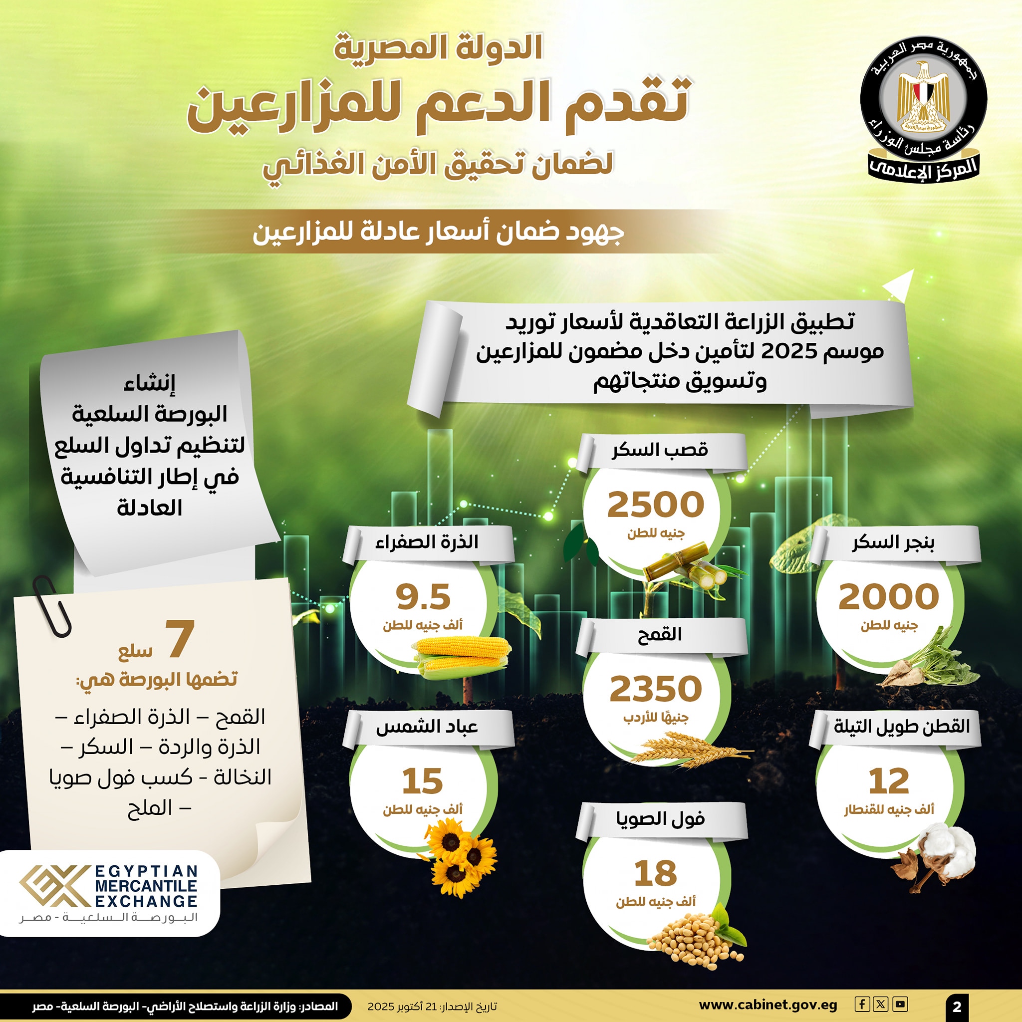 وفي إطار جهود دعم الدولة للمزارعين لضمان أسعار عادلة، أوضحت الإنفوجرافات، أنه تم تطبيق الزراعة التعاقدية لأسعار توريد موسم 2025، لتأمين دخل مضمون للمزارعين وتسويق منتجاتهم، حيث بلغ سعر توريد طن قصب السكر 2500 جنيه، وسعر توريد طن بنجر السكر 2000 جنيه، في حين بلغ سعر توريد أردب القمح 2350 جنيهًا.