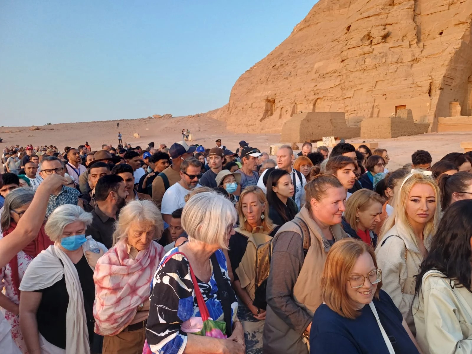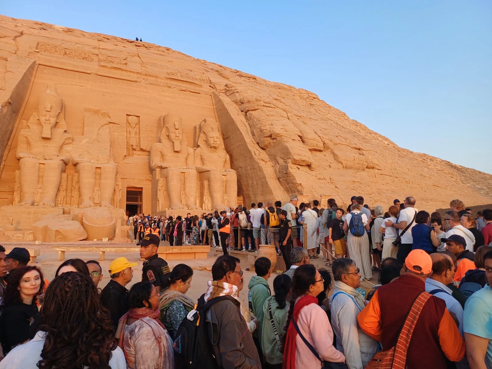 واصطف الزوار في طابور طويل أمام المعبد، في مشهد سياحي لافت، لمتابعة تسلل أشعة الشمس إلى قدس الأقداس، حيث تتعامد على وجه تمثال الملك رمسيس الثاني داخل المعبد، في دلالة فلكية ومعمارية تؤكد عبقرية المصري القديم.