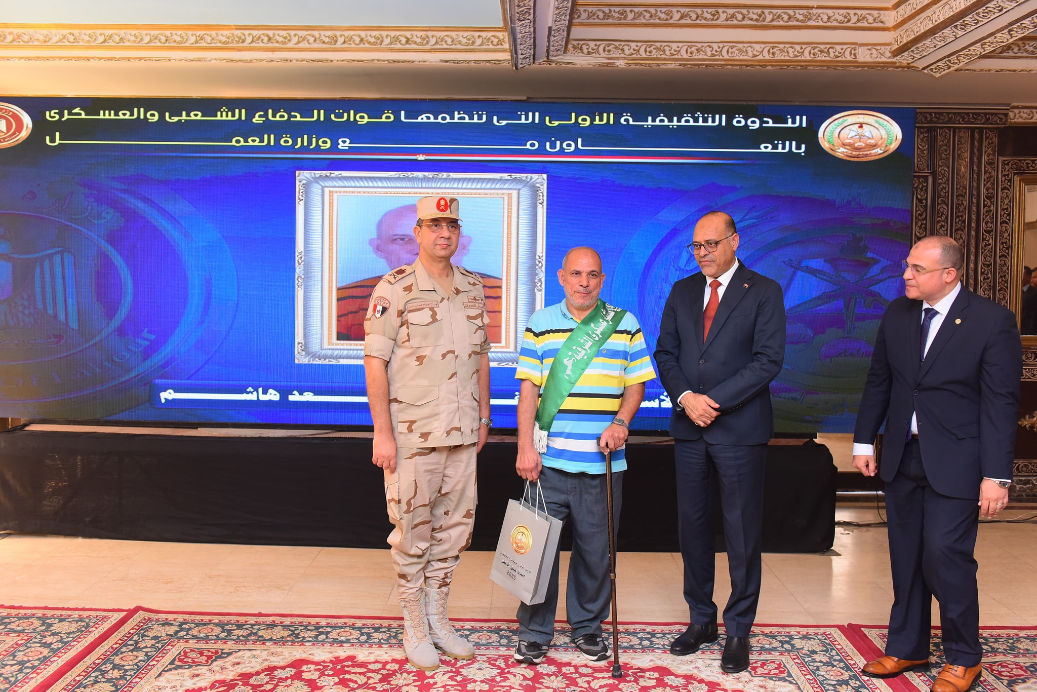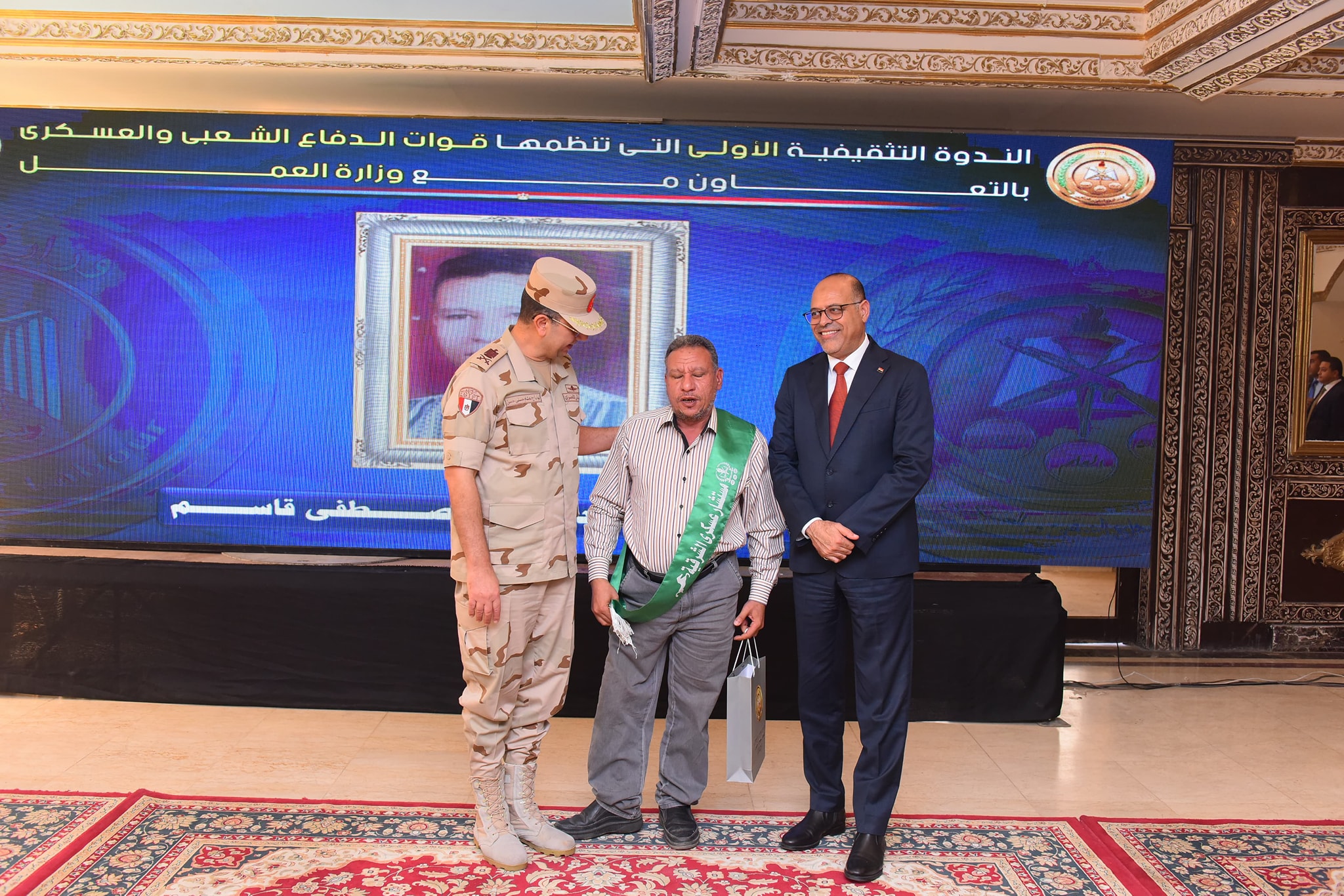 حضر الندوة اللواء أركان حرب قائد قوات الدفاع الشعبي والعسكري، وعدد من قيادات وزارة العمل والقوات المسلحة، فضلًا عن مجموعة من الشباب والعمال من مختلف القطاعات.