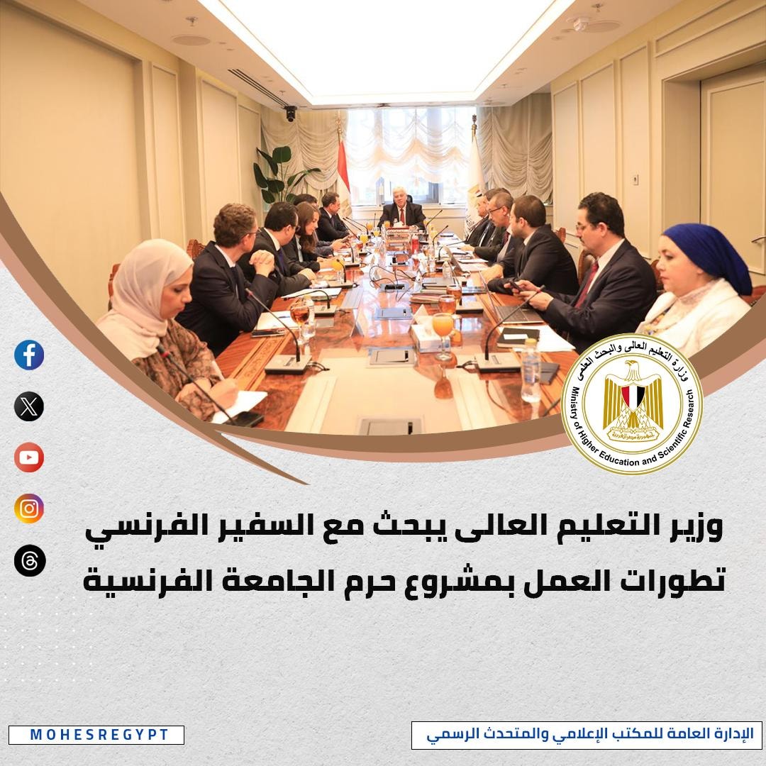 استقبل الدكتور أيمن عاشور، وزير التعليم العالي والبحث العلمي، السيد إيريك شوفالييه، سفير فرنسا بالقاهرة، واستعرض الاجتماع سير الأعمال الإنشائية بالحرم الجديد، وما تمّ من خطوات فعلية على أرض الواقع، واستمع الوزير إلى تقرير تفصيلي حول معدّلات التنفيذ.