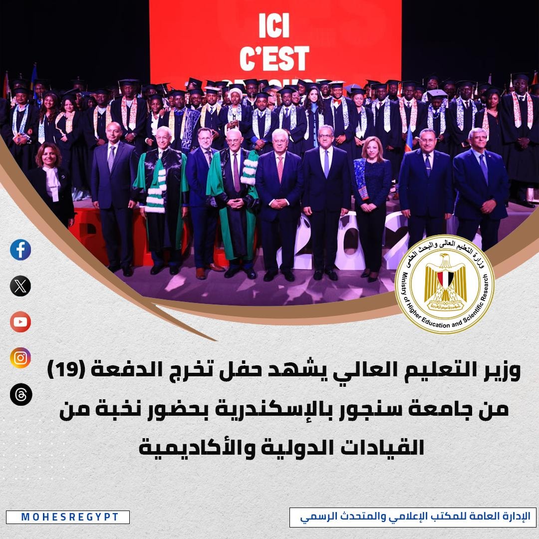 شهد د.أيمن عاشور وزير التعليم العالي والبحث العلمي، فعاليات حفل تخرج الدفعة (19) من جامعة سنجور بالإسكندرية، وفي كلمته، أعرب الوزير عن سعادته بالمشاركة في حفل تخرج الدفعة (19) من جامعة سنجور، مؤكدًا أن هذه الجامعة العريقة تعد رمزًا مضيئًا لمسيرة التعاون المثمر بين مصر ومنظمة الفرانكفونية، ونموذجًا رائدًا للشراكة الفاعلة من أجل التنمية في القارة الإفريقية.
