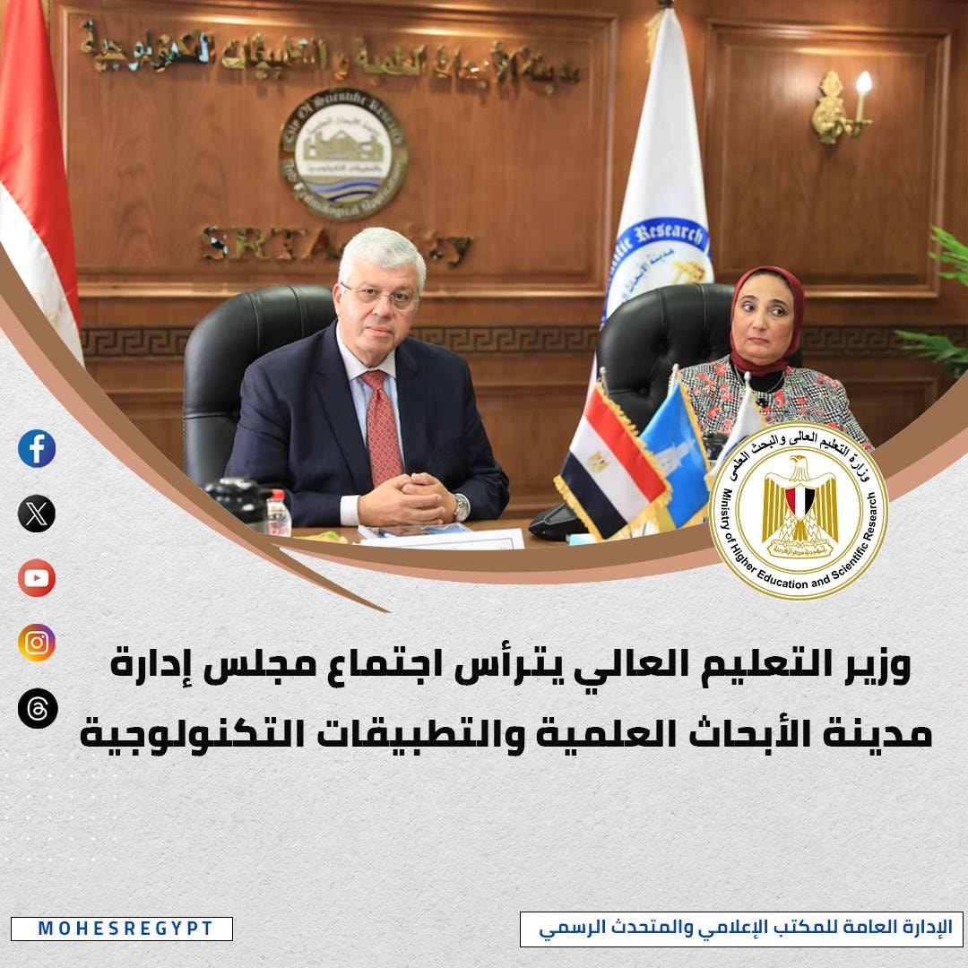 ترأس د.أيمن عاشور وزير التعليم العالي والبحث العلمي اجتماع مجلس إدارة مدينة الأبحاث العلمية والتطبيقات التكنولوجية، وشهد الاجتماع استعراض أبرز أنشطة وإنجازات مدينة الأبحاث العلمية والتطبيقات التكنولوجية، كما قام الوزير بجولة تفقدية داخل مدينة الأبحاث العلمية والتطبيقات التكنولوجية، شملت معرضًا يضم عددًا من النماذج الأولية والابتكارات التي تنفذها المدينة في مجالات الطاقة، والمياه، والزراعة، والصحة، والصناعة، ووجه سيادته بأهمية مواصلة الجهود لربط البحث العلمي بالصناعة، ودعم المشروعات ذات الجدوى الاقتصادية والمردود المجتمعي، بما يسهم في تحقيق أهداف التنمية المستدامة ورؤية مصر 2030.