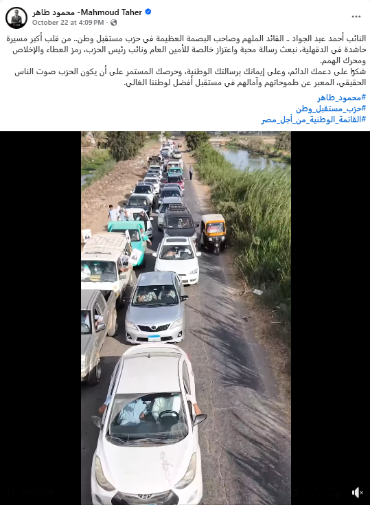 "النائب أحمد عبد الجواد، القائد الملهم وصاحب البصمة العظيمة في حزب مستقبل وطن، من قلب أكبر مسيرة حاشدة في الدقهلية، نبعث رسالة محبة واعتزاز خالصة للأمين العام ونائب رئيس الحزب، رمز العطاء والإخلاص ومحرك الهمم.