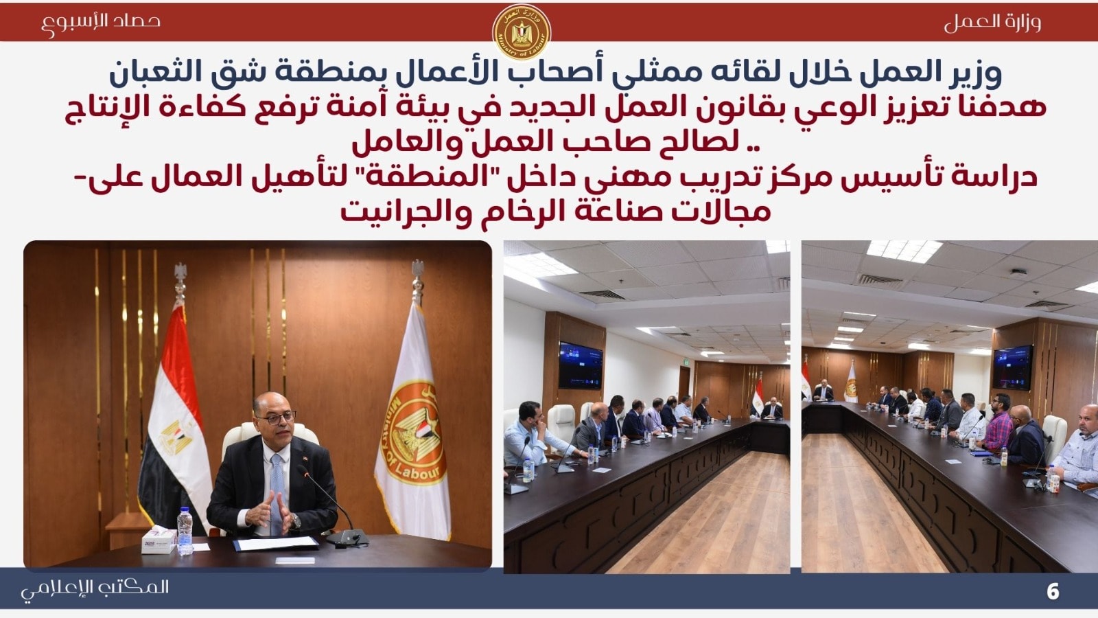 التقى الوزير وفدًا من أصحاب الأعمال بمنطقة شق الثعبان لبحث سبل التعاون وتطبيق أحكام القانون الجديد، ووجّه بدراسة إنشاء مركز تدريب مهني داخل المنطقة لتأهيل العمال على صناعة الرخام والجرانيت، إلى جانب مبادرة لتنظيم أوضاع العمالة الأجنبية بتراخيص عمل محددة.