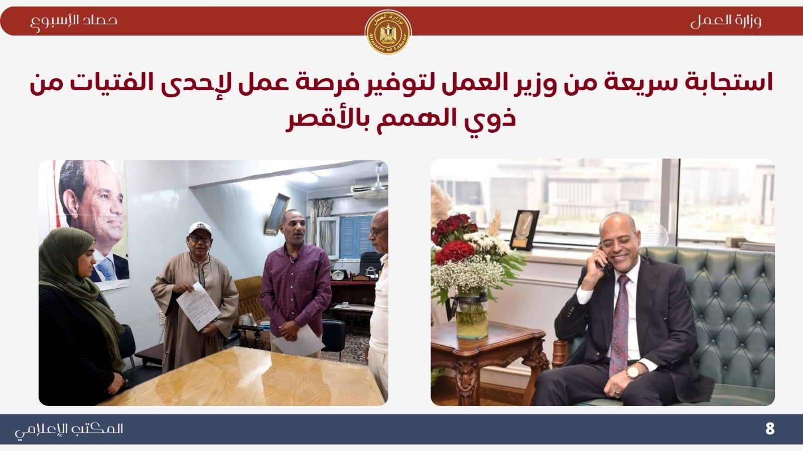 وجّه الوزير بسرعة الاستجابة لاستغاثة الفتاة شيماء محمد سعيد من ذوي الهمم، وتم توفير فرصة عمل مناسبة لها بإحدى المنشآت التابعة لمديرية العمل بقنا بنظام العمل عن بُعد، تنفيذًا لتوجيهات القيادة السياسية بتمكين ذوي القدرات الخاصة ودمجهم في سوق العمل.